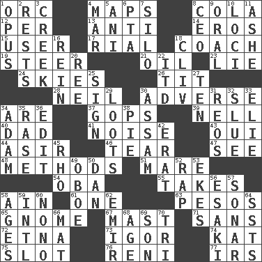ACROSS 1. The grampus (Milton) 4. Atlas contents 8. Root beer relative 12. For each 13. Against 14. Greek god of love 15. One who uses or employs something 17. Monetary unit of Yemen 18. Team commander 19. Guide 21. Petroleum 23. Whopper 24. Atmospheres 26. Teat (slang) 28. Famous astronaut Armstrong 30. Contrary to your interests or welfare 34. "We ___ not amused" (Victoria) 37. Republicans 39. 1994 drama film starring Jodie Foster 40. June honoree 41. Annoying sound 43. Fr. "Yes" 44. SW Saudi Arabia district 46. Rend 47. Perceive with the eye 48. Modes 51. Female horse 54. Chief or king in Benin or Nigeria 55. Proceeds 58. The 18th letter of the Arabic alphabet 61. Single 63. Mexican monetary units 65. Dwarf 67. Vertical spar for supporting sails 71. Without 72. Inactive volcano in Sicily 73. Russian composer Stravinsky 74. Krazy ___ of comics 75. Narrow, elongated depression 76. Painter Guido (1575-1642) 77. Big collection agency DOWN 1. Musical composition 2. Musical pauses 3. Small stream 4. Make imperfect 5. Cuckoo 6. Parent Teacher Association (abbr.) 7. Grain storage tower 8. Corporate head (abbr.) 9. Relating to the mouth 10. Locales 11. American tennis player Robert 16. It's straight from the horse's mouth 18. 154 in Roman numerals 20. Portuguese money of account (variant) 22. It would 25. Signal 27. "___ Little Indians" 29. Plunders 30. Indian state 31. Vintage cars 32. Turn sharply 33. Writer Wiesel 34. First of billions? 35. Raze (variant) 36. Prepare for publication 38. Sliced dessert 42. Part of Q.E.F. 45. 17th letter of the Greek alphabet 49. Mitch Miller's instrument 50. Daniel's nick name 52. Strike 53. Supplements with great effort 56. 1973 Nobel Price Winner (Physics) Leo 57. Echolocation 58. Grows older 59. International (abbr.) 60. Words to Nanette 62. Independent ruler or chieftain 64. Fast planes 66. Floor protector 68. Mature 69. Boy, to dad 70. Three (prefix)