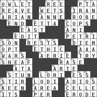 ACROSS 1. A small or young owl 6. Portuguese money of account (variant) 9. Parent Teacher Assoc. 12. Break or tear apart 13. Soaks 14. SW Asia republic 15. Believer in; advocate of (suffix) 16. Queen of England 1702-14 17. Loose flowing garment 18. Conclude 19. Singer James 20. 911 reaches them 21. Compass direction 23. Cuckoo 24. Prepare for publication 25. _ dish (used to culture cells) 28. Male offspring 30. Musical pauses 34. South Vietnam president (1954) 35. Choose 36. Principle of right and wrong 38. Auto club (abbr.) 39. Armed conflicts 41. Nest on high 43. Attempt to accomplish something 44. Bundle of cut stalks of grain 46. To erase 48. "One Day ___ Time" 49. Johnson of "Laugh-In" 50. Surprise greatly 51. Australian parrot (variant) 53. Double-curved letter 56. Commotion 57. Farming town in central California 58. Goodbye (Sp.) 60. Peachy ____! 61. Type of rug 62. Cell (Danish) 63. It is 64. For each 65. Eat (away) DOWN 1. Mouth or opening 2. We are 3. (Had) reclined 4. Eluded 5. Nine, plus one 6. Monthly bill 7. Inactive volcano in Sicily 8. Compass dir. 9. Conciliate 10. Bar bills 11. One (Scot) 13. Electrical Unit 14. Pressed 19. First name in cosmetics 20. Head covering 22. Wind 24. Pleas 26. Tail end 27. "If ____ say so..." 28. Sty mamas 29. Brightly colored fish 31. R.R. building 32. Definite Article 33. Title for a knight 37. High-altitude cloud 40. Titan orbits this 42. Ingest 45. Air blower 47. Sowing specialist 49. Operatic vocal solo 50. Proofreading order 51. Old wives' tales, e.g. 52. River in Europe 54. Grain storage tower 55. Disposed of to a purchaser 56. What Jean-Claude Killy likes to do 57. Infant locale 58. Adept person 59. Perceive with the eye