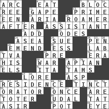 ACROSS 1. Curve 4. Erode 7. Alliance 11. To separate or throw off 12. Open wide 13. First class 14. Car or cant ending 15. Roberta Peters solo 16. Nomad 17. Following 19. Aide 21. Increase 23. Lyric poems 24. Toward the sea 25. Take to court 26. Fenced enclosure 29. Make improvements or corrections to 30. Curvy letter 31. Experiment locale 32. Federal power corp. 33. Before (prefix) 34. Period 35. Part of HMS, perhaps 36. Armed conflict 37. Bee-related 40. Raised railways 41. Call ___ day 42. Scottish caps 43. Old wives' tales, e.g. 45. Cleo's killer 46. Home 51. A color or tint 55. Speaker 56. Single time 58. "We ___ not amused" (Victoria) 59. Carrier 60. Hereditary estate 61. Make lace 62. SW Saudi Arabia district 63. Cooking vessel 64. Sight organ DOWN 1. Length times width 2. Coral collection 3. Penny 4. Hearing organ 5. Capital of Western Samoa 6. Afternoon social gatherings 7. Naughty children 8. Pale green bean 9. Presage 10. Certainty 12. Place where plants grow 13. Introduce or present, as a question 16. Amusement-park features 18. Comfort 20. Lush 22. Male parent 24. Collect or gather 25. Spanish missionary in California 26. Entreaties 27. Merit 28. Basketball assoc. 29. Tending to cause great harm 32. Definite Article 33. Eucharist need 36. One who wires 37. "One Day ___ Time" 38. Soft color 39. Body of Kaffir warriors 43. 61 cubic inches 44. Aroma 46. Round or rotation of duties 47. Greek god of love 48. Suttee (variant) 49. Clever action or accomplishment 50. Inside; within (prefix) 52. Nathan's nickname 53. Supercomputer manufacturer 54. Wig 57. Domesticated feline