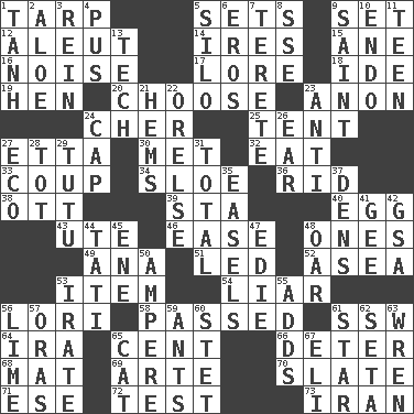 ACROSS 1. Canvas cover 5. Puts into a specified state 9. Put into a specified state 12. Native American of Southwest Alaska 14. Angers 15. A saturated hydrocarbon 16. Annoying sound 17. Old wives' tales, e.g. 18. Binary compound 19. Layer 20. Opt 23. At once, immediately (arch.) 24. "Mermaids" star 25. Portable shelter 27. Singer James 30. Was introduced to 32. Consume 33. Overturn; upset 34. A type of plum 36. To free from 38. Baseball player Mel 39. R.R. building 40. Ovum 43. Shoshoni 46. Relaxation 48. Washington bills 49. Santa ___, CA 51. Directed 52. Toward the sea 53. A distinct part 54. One who doesn't tell the truth 56. Australian parrot (variant) 58. Went by 61. Compass dir. 64. Lyricist Gershwin 65. Penny 66. Prevent from occurring 68. Floor covering 69. Johnson of "Laugh-In" 70. Schedule 71. Compass dir. 72. Trial 73. SW Asia republic DOWN 1. Hyperbolic tangent 2. Medicinal plant 3. It's straight from the horse's mouth 4. Fluid product of inflammation 5. Grain storage tower 6. Greek god of love 7. Cigar-shaped 8. Compass dir. 9. Inhabitant of Heaven 10. Inside; within (prefix) 11. Adolescent 13. Technical 21. Is hesitant and indecisive 22. Threatening words 23. Against 24. Head covering 26. Ewer handle 27. Environmental prefix 28. Small child 29. Ballerina skirt 31. Add up to 35. Artist's stands 37. Habitations of wild animals 41. Unit of force equal to gravity 42. Girls' org. (abbr.) 44. Jacques of French films 45. Compass dir. 47. Singer Brickell 48. Rowing implement 50. Electrical Unit 53. Feeling or showing extreme anger 55. Does sums 56. Welles in "The Third Man" 57. Mouths or openings 59. Pismires 60. Proofreading order 61. Play the lead 62. Bristle 63. Songbird 65. Domesticated feline 67. Connecticut Ivy Leaguer