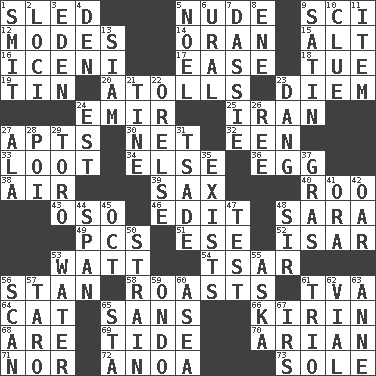 ACROSS 1. Downhill vehicle 5. Unadorned 9. _-fi 12. Methods 14. NW Algerian seaport 15. The first octave above the treble staff 16. Ancient Celtic tribe of eastern Britain 17. Comfort 18. Third day of the wk. 19. Shallow baking pan 20. Ringlike coral islands and reefs 23. South Vietnam president (1954) 24. Arab leader 25. SW Asia republic 27. Tenement units (abbr.) 30. Fish or hair follower 32. Car or cant ending 33. Spoils 34. Otherwise 36. Ovum 38. Atmosphere 39. Saxophone 40. Friend of Pooh 43. Bear (Spanish) 46. Prepare for publication 48. "Two Mules for Sister ____" 49. Personal Computers (abbr.) 51. Compass dir. 52. Austrian river, tributary to the Danube 53. Electrical Unit 54. Russian ruler of old 56. Comedian Laurel of Laurel & Hardy 58. Ridicules or criticizes harshly 61. Federal power corp. 64. Domesticated feline 65. Without 66. Japanese brewing company 68. "We ___ not amused" (Victoria) 69. Periodic rise and fall of the sea level 70. Believer in; advocate of (suffix) 71. And not 72. Small Philippine buffalo 73. Flatfish DOWN 1. Stricken, poetically 2. Venues 3. Paradise 4. Lair 5. Christmas carol 6. Mountain range 7. Hyrax 8. Compass dir. 9. Smooth fabric 10. A slight indication 11. A whole individual unit 13. Thailand, formerly 21. Prong on a fork 22. Threatening words 23. Mild oath, euphamism for damn 24. Eastern Standard Time (abbr.) 26. Portuguese money of account (variant) 27. According to 28. Luau course 29. "Corrida" creature 31. Sadhe (variant) 35. Has an existence 37. Pate de foie ____ 41. Mouth or opening 42. Rowing implement 44. Connect, as a bridge 45. Sep. follower 47. Trial 48. Title for a knight 50. Put through a sieve 53. Wetness 55. "____ silly question..." 56. Glance over 57. Pacific island yam 59. Southwest Nigerian state 60. At sea 61. Musical group of three 62. Small bottle 63. Queen of England 1702-14 65. R.R. building 67. Big collection agency