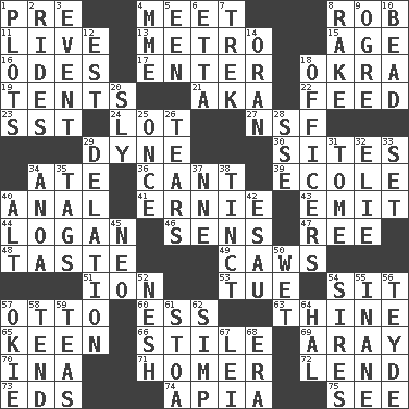 ACROSS 1. Before (prefix) 4. Rendezvous 8. Director Reiner 11. Moving, as bait 13. Paris' subway 15. Personal question 16. Lyric poems 17. Keyboard key 18. Gumbo ingredient 19. Portable shelters 21. Alias (abbr.) 22. Nourish 23. Fast jet (abbr.) 24. Car dealer's back yard 27. Overdraft (abbr.) 29. Centimeter-gram-second unit of force 30. Settings 34. Had dinner 36. Patter 39. Learning spot: Fr. 40. Of or related to the anus 41. Bert's buddy 43. Give off 44. Utah city north of Ogden 46. Elected reps. 47. Portuguese money of account (variant) 48. Clothes sense 49. Crow sounds 51. Electrically charged atom 53. Third day of the wk. 54. Be seated 57. "Beetle Bailey" pooch 60. Double-curved letter 63. One or ones belonging to thee 65. Peachy ____! 66. Vertical member of a panel or frame 69. Like ___ of sunshine 70. _ tizzy (2 wds.) 71. Home run 72. Grant temporary use of 73. Begley and Asner 74. Capital of Western Samoa 75. Observe DOWN 1. Schemes 2. Amusement-park features 3. Incident 4. Madame (abbr.) 5. Car or cant ending 6. Singer James 7. Long journey 8. Libertine 9. Legendary monster 10. Necklace unit 12. Eastern Standard Time (abbr.) 14. Northwest Algerian city 18. Persons of authority 20. Insidious 25. At one time in the past 26. Lacerates 28. Compass dir. 29. Conveyance 31. Heavy book 32. Writer Wiesel 33. Put into a specified state 34. Small Philippine buffalo 35. Labels 37. Compass dir. 38. Colored lightly or faintly 40. The first octave above the treble staff 42. He sold his birthright 45. Modern: prefix 50. Soggy 52. Tender 54. Titles for men of rank and authority 55. Empty; void 56. Miss Universe 1986, Barbara Palacios _ 57. Migrant worker of the '30s 58. Look after 59. Afternoon social gatherings 61. Portico 62. Simple or foolish person 64. Actor Linden 67. Luau accessory 68. Period