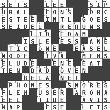 ACROSS 1. Puts into a specified state 5. Area sheltered from the wind 8. Small drink 11. Mountain range 12. Immeasurably long periods of time 14. The grampus (Milton) 15. First name in cosmetics 17. International (abbr.) 18. Leaves 19. Beer mug 21. Summer TV shows 23. Hat (slang) 25. Dutch treat 26. Capri or Wright 27. Double-curved letter 28. Deep reverence 31. Nervous spasm 33. Single 35. Artist's stand 37. Method 38. Federal power corp. 40. Not women's 41. Evade 43. Compass dir. 45. Consume 46. Nine, plus one 47. June honoree 50. Baking chamber 52. Actor Lugosi 53. Fish or hair follower 54. Gives a jingle 56. Sounds asleep 61. Soared 62. One who uses or employs something 65. Odor 66. Snakelike fish 67. Periodic rise and fall of the sea level 68. Deliberation 69. Atlas unit 70. Compass dir. 71. Allows DOWN 1. Institutes legal proceedings 2. Celtic language 3. Jacques of French films 4. Downhill vehicle 5. Luau accessory 6. Period of immesurable duration 7. Main course 8. Within a short period 9. Angers 10. Personal Computers (abbr.) 13. Bobsleighs 16. Snakelike fish 18. Chewing product 20. _ and Stitch 22. Raze (variant) 24. Incision 26. On the rocks 28. At sea 29. Left 30. Raised railways 31. Lacquered or enameled metalware 32. Goddess of spring and wife of Bragi 34. Night before a holiday 36. So be it 37. Was introduced to 39. At once, immediately (arch.) 42. Locale of original sin 44. Nights before holidays 48. Eskimo relative 49. Hyrax 51. Inactive volcano in Sicily 52. Arrow shooter 54. Entreaty 55. Assist 57. Spoken 58. Be footloose 59. Give off 60. Backtalk 61. Opposite of masc. 63. Begley and Asner 64. To sift