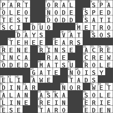 ACROSS 1. Role in a play 5. Taken by mouth 9. Health resort 12. Margarine 13. Thickened enlargement 14. Moved rapidly 15. Trial 16. Texas town _ City 17. Suttee (variant) 18. _-fi 19. Superhero pair 21. Paris' subway 22. 24-hour periods 24. Large container 26. Mayday 27. Giggle 28. Hearing organs 29. French philosopher Descartes 30. Remove soap 32. Land measure 36. South American Indian 37. Actress Charlotte 38. Group working together 39. Wrote a lyric poem 40. Taiwanese island in East China Sea 42. Hero or heavy, e.g. 43. Yard entry 44. Annoyingly loud 46. Biblical high priest 49. Deep reverence 50. Small amounts or degrees 51. Middle Eastern gold or silver currency 53. Or not 54. Soggy 57. Actor Alda or Thicke 58. "____ silly question..." 61. Flatfish 62. Actor's bit 63. It's straight from the horse's mouth 64. 4th largest of the Great Lakes 65. Compass dir. 66. Pacific island yam 67. Paradise DOWN 1. Cooking vessels 2. Actor Baldwin 3. Dwelling 4. Small child 5. Southwest Nigerian state 6. Friend of Pooh 7. Increase 8. Directed 9. Arguments over trivial matters 10. Stone: prefix 11. Goodbye (Sp.) 14. Compass dir. 19. Color 20. One who makes use of a thing 21. Mountains (abbr.) 23. Having the leading position 24. Flower holders 25. "We ___ not amused" (Victoria) 27. Look after 28. Related on the mother's side 29. _ de Janeiro 31. Feeling or showing extreme anger 32. Sour-tasting 33. What you're doing now 34. Trust 35. She-sheep 40. Opening into something insatiable 41. To (old English) 43. Slender fish 45. Boat paddle 46. Peak District village in England 47. Ms. Damita and namesakes 48. Empty; void 52. A saturated hydrocarbon 53. Billionth: prefix 55. Writer Wiesel 56. Adolescent 58. Tate display 59. Ocean 60. Apertif with cassis 61. Observe