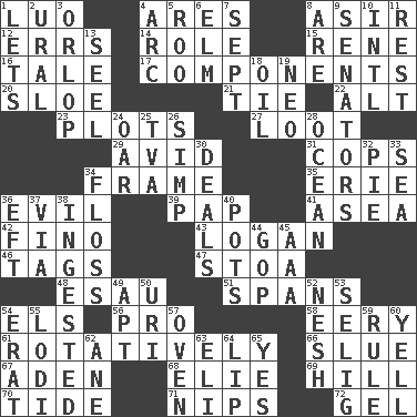 ACROSS 1. Nilotic language 4. Ancient Greek god of war 8. SW Saudi Arabia district 12. Blunders 14. Hero or heavy, e.g. 15. French philosopher Descartes 16. Falsehood 17. Pieces 20. A type of plum 21. Make a knot 22. The first octave above the treble staff 23. Schemes 27. Spoils 29. Enthusiastic 31. 911 reaches them 34. Movie unit 35. 4th largest of the Great Lakes 36. Morally bad or wrong 39. Infant food 41. Toward the sea 42. A pale, very dry sherry 43. Utah city north of Ogden 46. Labels 47. Portico 48. He sold his birthright 51. Connects, as a bridge 54. Raised railways 56. Adept person 58. Suggestive of the supernatural 61. Rotating or pertaining to rotation 66. Change direction abruptly 67. Arabian gulf 68. Writer Wiesel 69. Land elevation 70. Event that recurs at intervals 71. Pinches, bites 72. Set DOWN 1. Allows 2. Mountain range 3. Lowest deck of a ship 4. Curve 5. Friend of Pooh 6. Shade tree 7. Back-to-school mo. 8. "We ___ not amused" (Victoria) 9. Elected representatives 10. International (abbr.) 11. Take ten 13. Sew up the eyelids of hawks and falcons 18. Petroleum 19. Modern: prefix 24. Rowing implement 25. Federal power corp. 26. Simple or foolish person 28. Sea 30. Allots cards 32. Sliced dessert 33. Ocean 34. Soft thread for cleaning between teeth 36. Lizard (obsolete) 37. By way of 38. Eaten 40. Cooking vessels 44. Grand Old Party 45. American Automobile Association (abbr.) 49. Fitting 50. RI univ. 52. Delicate 53. Major League Baseball Commissioner Bud 54. Part of Q.E.F. 55. Farming town in central California 57. Baking chamber 59. Governing power 60. Shout 62. One (Scot) 63. Connecticut Ivy Leaguer 64. Mouth edge 65. Affirmative reply