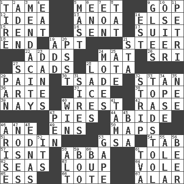 ACROSS 1. Docile 5. Rendezvous 9. Grand Old Party 12. It may be bright or harebrained 13. Small Philippine buffalo 14. Otherwise 15. Monthly bill 16. Posted 17. Set or collection 18. Conclusion 19. Fitting 21. Guide 22. Does sums 24. Floor protector 26. Indian title of respect (Mr.) 27. Loads 28. Globular water bottle used in Asia 29. Ache 30. Sadhe (variant) 32. Comedian Laurel of Laurel & Hardy 36. Johnson of "Laugh-In" 37. Frozen water 38. Drink excessively 39. Negative votes 40. Take or capture by force 42. Raze (variant) 43. Sliced desserts 44. Tolerate 46. A saturated hydrocarbon 49. Followers of ems 50. Atlas contents 51. "The Thinker" sculptor 53. Girls' org. (abbr.) 54. Keyboard key 57. Is not 58. Swedish rock group 61. Lacquered or enameled metalware 62. Oceans 63. Central Nebraska county 64. Grand slam 65. Double-curved letter 66. Carryall 67. Having or resembling wings DOWN 1. Hoop that covers a wheel 2. Arabian gulf 3. Ananias' fault 4. Consume 5. Vertical spar for supporting sails 6. Compass dir. 7. Period of immesurable duration 8. Make lace 9. Adhesives 10. Flexible twig of a willow tree 11. _ dish (used to culture cells) 14. Eastern Standard Time (abbr.) 19. Say or write further 20. Inconspicuous attention getter 21. R.R. building 23. Natives or inhabitants of Denmark 24. Methods 25. Had dinner 27. "Two Mules for Sister ____" 28. Shoestrings 29. Baking dish 31. Male parents of animals 32. Long narrow piece of something 33. Inedible or poisonous agaric 34. Domed church section 35. Born 40. Victory 41. Scottish caps 43. Animal enclosure 45. Sound made by sheep 46. Originate 47. Olfactory organs 48. Ferber et al. 52. ___ a Wonderful Life 53. Yawn 55. Silent film actress Nazimova 56. Fermented drink made from hops 58. Keyboard modifier key 59. Surprise greeting 60. With the exception that 61. Federal power corp.