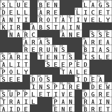 ACROSS 1. Turn sharply 5. Benjamin's nick name 8. Straggles 12. Small valley 13. "We ___ not amused" (Victoria) 14. It is permitted: Lat. 15. Opposed to 16. Rotating or pertaining to rotation 19. Apertif with cassis 20. Choose not to consume 21. Drug cop 23. A saturated hydrocarbon 24. Compass dir. 27. Caspian sea tributary 30. Length times width 31. Summer TV shows 34. Prejudice 35. Indian skirt 38. Portable shelters 40. Small island 41. Came down and settled, as after flight 42. Oozed 44. More than one (prefix) 45. Lie 46. Observe 47. Two (Sp.) 50. The main thing one is thinking about 53. Heighten or intensify 57. Morning condensation 59. Supplying deficiencies 63. Legendary monster 64. Drop behind 65. Baking dish 66. Water falling in drops from the sky 67. Helper 68. Compass dir. 69. Cy Young winner Saberhagen DOWN 1. Neighbor of Neb. 2. Soviet premier 1918-24 3. Extremist 4. Biblical high priest 5. Sharp remark 6. Greek god of love 7. Remaining after all deductions 8. 54 in ancient Rome 9. Adept person 10. Set 11. Filthy place 14. Actor's bit 17. Auto club (abbr.) 18. Shallow baking pan 20. Measure of real estate 22. Noteworthy scarcity 24. Indian titles of respect 25. Lick closed 26. Relaxation 28. Nonscientific branch of learning 29. Takes to court 30. Stayed 32. Compass dir. 33. Proofreading order 35. Plant excrements 36. _ vera 37. Cause heat under the collar 39. Health resort 43. Writer Wiesel 47. Deli pickle 48. Single 49. Fast jet (abbr.) 51. _ Allan Poe 52. Nest on high 54. Corncob 55. "Terrible" tsar 56. French philosopher Descartes 58. Gone 59. R.R. building 60. RI univ. 61. Groovy apt. 62. Sliced dessert 63. Globe