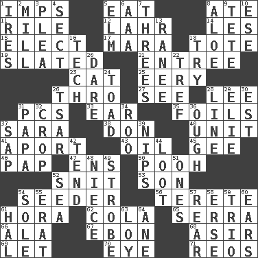 ACROSS 1. Naughty children 5. Consume 8. Had dinner 11. Cause heat under the collar 12. Cowardly lion portrayer 14. French article 15. Voters do this 17. Hindu Mythology: god of death 18. Haul 19. Scheduled 21. Main course 23. Domesticated feline 25. Suggestive of the supernatural 26. Through, poetically 27. Observe 28. Area sheltered from the wind 31. Personal Computers (abbr.) 33. Hearing organ 35. Fencing necessities 37. "Two Mules for Sister ____" 38. Spanish title 40. A single undivided whole 41. To the left, to Queeg 43. Petroleum 45. Turn to the right 46. Infant food 47. Followers of ems 50. "Silly old bear" 52. In a ____ (agitated or irritated) 53. Manchild 54. Sowing specialist 56. Cylindrical with tapered ends 61. Israeli folk dance 62. Root beer relative 65. Spanish missionary in California 66. Wing 67. Inky black, to poets 68. SW Saudi Arabia district 69. Allow 70. Sight organ 71. Vintage cars DOWN 1. Angers 2. Place where flour is made 3. Entreaty 4. Religious group 5. Shade tree 6. Auto club (abbr.) 7. Triplets 8. _ vera 9. Wig 10. Compass dir. 13. Indian princess (variant) 16. Technology 18. Attempt to accomplish something 20. Have the gumption 22. Unclean, religiously 24. Frog relative 26. Russian ruler of old 28. Actor's bit 29. Writer Wiesel 30. Eastern Standard Time (abbr.) 31. Dad 32. Riding implement 34. Friend of Pooh 36. Ending for "Through" and "Enough" 37. Plant excrement 39. Pinches, bites 42. Be inclined (to) 44. Spoils 48. Sibling's daughter 49. Disco prop 51. Singles 52. Ocean 54. Not divided or shared with others 55. Part of Q.E.F. 57. Buttocks 58. Celtic language 59. Musical group of three 60. Hearing organs 61. Actor Linden 63. Myrna of the movies 64. One (Scot)