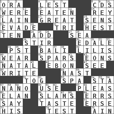 ACROSS 1. Mouth or opening 4. For fear that 8. Music discs 11. We are 13. Eroded 15. Marina Del _, California 16. (Had) reclined 17. Relatively large 18. Elected reps. 19. Dodge 21. Three (prefix) 22. Behest 23. "___ Little Indians" 24. Increase 27. Ocean 29. Commotion 30. Peak District village in England 34. Pacific Standard Time (abbr.) 36. Indonesian resort city 39. Ms. Damita and namesakes 40. Erode 41. Practice fights 43. Immeasurably long periods of time 44. Brizilian seaport 46. Inky black, to poets 47. Perceive with the eye 48. Compose 49. Political cartoonist Thomas 51. Coat; cloak 53. Health resort 54. R.R. building 57. Billionth: prefix 60. Purpose 63. Entreaties 65. Enthusiasm 66. Shuts with force 69. Blunders 70. Declare 71. Clothes sense 72. Celtic language 73. Part of HMS, perhaps 74. Trial 75. The 18th letter of the Arabic alphabet DOWN 1. A small or young owl 2. Break or tear apart 3. Believer in; advocate of (suffix) 4. Part of a journey 5. Hearing organ 6. Proofreading order 7. Separate forcefully 8. Algonquian 9. Habitations of wild animals 10. System (abbr.) 12. Conclusion 14. Nuclear Threat Initiatives 18. Most questionable 20. Consume 25. Rights 26. Window treatment 28. Snakelike fish 29. Ski resort town in Vermont 31. _ vera 32. Actor's bit 33. Double-curved letter 34. Lightbulb-shaped fruit 35. Suttee (variant) 37. Experiment locale 38. Metal shackles 40. Compass dir. 42. Fastener 45. Lion 50. Plant excrement 52. Abrupt rush of wind 54. Father Junipero _ 55. Tarsus (plural) 56. NE Netherlands city 57. Delicate 58. Mountain range southwest of Kyrgyzstan 59. Negative votes 61. Narrow board 62. Comfort 64. Area sheltered from the wind 67. Mountains (abbr.) 68. Put into a specified state