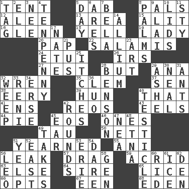 ACROSS 1. Portable shelter 5. Small moist lump or mass 8. Friends 12. Toward shelter 13. Type of rug 15. Set down 16. American astronaut and politician John 18. Shout 19. Kenny Rogers chart-topper in '80 20. Infant food 22. Deli grouping 24. Needle holder 26. Big collection agency 27. A home for chicks 28. On the contrary 29. Santa ___, CA 32. Songbird 35. Clement's nick name 37. Elected rep. 38. Suggestive of the supernatural 39. Attila the _ 40. Not this but _ 41. Followers of ems 42. Vintage cars 43. Snakelike fish 44. Sliced dessert 45. Greek goddess of the dawn 46. Washington bills 49. The 19th letter of the Greek alphabet 50. Remaining after all deductions 51. Had a strong desire 55. Cuckoo 56. Path through which fluid escapes 57. To trail on the ground 59. Sour-tasting 63. Otherwise 64. Father 65. Louse (plural) 66. Elects 67. Car or cant ending 68. Genesis locale DOWN 1. Label 2. Pipe bend 3. Born 4. 3-inch nail 5. 24 hours 6. Ancient Greek god of war 7. Actor Lugosi 8. Insides of hands 9. Mountain range southwest of Kyrgyzstan 10. Flaplike coverings 11. Filthy place 14. Plant genus of onion and garlic 17. Nathan's nickname 21. Festering 23. Tate display 25. Strong, restless desires 28. Gillaume's butler role 29. American tennis player Robert 30. Anneal 31. Pismires 32. Shed a tear 33. Painter Guido (1575-1642) 34. Celtic language 36. Nilotic language 40. One of the two male reproductive glands 42. Periods in a boxing match 45. Hearing organ 47. Teachers' org. 48. Inactive volcano in Sicily 49. Proceeds 51. Sharp bark 52. Compass direction 53. 4th largest of the Great Lakes 54. Have the gumption 56. Lion 58. Commissioned military rank (abbr.) 60. To free from 61. Frozen water 62. Lair