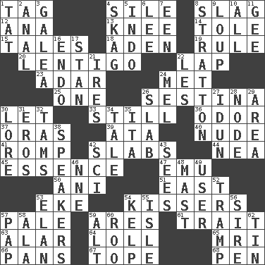 ACROSS 1. Label 4. Drop; flow; fall 8. Volcanic refuse 12. Santa ___, CA 13. Leg joint 14. Lacquered or enameled metalware 15. Lies 18. An important port of Yemen 19. General guideline 20. Small, flat, pigmented spot on the skin 22. Pet locale 23. The sixth month of the Jewish calendar 24. Was introduced to 25. Single 26. French poetic form 30. Allow 33. Not moving 36. Aroma 37. Mouths or openings 39. _ moment's notice (2 wds.) 40. Naked 41. Frolic 42. Broad, flat, thick pieces 44. Teachers' org. 45. Gist 47. Australian flightless bird 50. Black tropical American cuckoo 51. Compass direction 53. Supplement with great effort 54. Smoochers 57. Light colored 59. Ancient Greek god of war 61. Distinguishing feature 63. Having or resembling wings 64. Hang loosely or laxly 65. Medical imaging device (abbr.) 66. Baking dishes 67. Drink excessively 68. Writing instrument DOWN 1. Make lace 2. Of or related to the anus 3. An organ shaped like a helmet 4. Heroin 5. _ china 6. Area sheltered from the wind 7. Car or cant ending 8. Ski resort town in Vermont 9. Central Nebraska county 10. Everything 11. Turn to the right 16. Inside; within (prefix) 17. Comedian Laurel of Laurel & Hardy 21. Angers 22. French article 24. Cartoonist voice _ Blanc 26. Broad, flat, thick piece 27. Goddess of spring and wife of Bragi 28. Thickened enlargement 29. Type of rug 30. Old wives' tales, e.g. 31. Greek god of love 32. Scottish caps 34. Falsehood 35. Call ___ day 38. Orators 42. _-fi 43. Observes 46. Compass dir. 48. Vertical spar for supporting sails 49. One who makes use of a thing 52. _____ steamer (cargo ship) 53. Enthusiasm 54. Seaweed 55. Capri or Wright 56. Title for a man of rank and authority 57. Infant food 58. Wing 59. The first octave above the treble staff 60. Friend of Pooh 62. Shallow baking pan