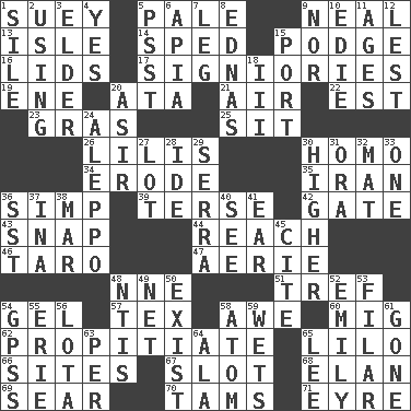 ACROSS 1. Chop _ 5. Diluted with white 9. Be tempered by heat 13. Capri or Wright 14. Drove too fast 15. Plash 16. Hats (slang) 17. Seigniories (variant) 19. Compass dir. 20. "One Day ___ Time" 21. Atmosphere 22. Eastern Standard Time (abbr.) 23. Pate de foie ____ 25. Be seated 26. Ms. Damita and namesakes 30. Like (prefix) 34. Wear away 35. SW Asia republic 36. Simple or foolish person 39. Laconic 42. Yard entry 43. Fastener 44. Arrive at 46. Pacific island yam 47. Nest on high 48. Compass dir. 51. Not kosher 54. Set 57. John Ritter's dad 58. Deep reverence 60. Russian fighter aircraft 62. Conciliate 65. _ and Stitch 66. Locates 67. Groove 68. Flair 69. Singe 70. Scottish caps 71. Jane of fiction DOWN 1. Drop; flow; fall 2. Exploiting 3. A person who is older than you are 4. Affirmative reply 5. Inconspicuous attention getter 6. Capital of Western Samoa 7. Part of a journey 8. Ferber et al. 9. Not either 10. Singer Brickell 11. Ripens 12. For fear that 15. Sweet dark-red dessert wine 18. One more than two 20. SW Saudi Arabia district 24. City in Syria 27. Car dealer's back yard 28. Binary compound 29. Spanish missionary in California 30. Having greater elevation 31. Mouth or opening 32. Floor protector 33. Single 36. Fast jet (abbr.) 37. _ tizzy (2 wds.) 38. Make imperfect 40. Perceive with the eye 41. Hearing organ 45. Quote 48. Nuclear Threat Initiatives 49. Fish or hair follower 50. Be 52. Poet Dickinson 53. Of or pertaining to a thread or threads 54. Global Positioning Systems (abbr.) 55. 4th largest of the Great Lakes 56. Globular water bottle used in Asia 58. Tiny particle 59. Soaks 61. Went 63. For each 64. Wing 65. Area sheltered from the wind