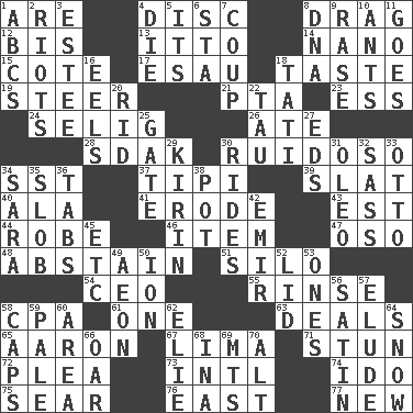 ACROSS 1. "We ___ not amused" (Victoria) 4. Compact _ 8. To trail on the ground 12. Altar cloth linen 13. "Tell ____ the Marines!" 14. Billionth: prefix 15. ____ d'Azur (French Riviera) 17. Son of Isaac 18. Clothes sense 19. Navigate 21. Parent Teacher Association (abbr.) 23. Double-curved letter 24. Major League Baseball Commissioner Bud 26. Had dinner 28. Neighbor of Neb. 30. Noisy, rowdy, vocal (Spanish) 34. Fast jet (abbr.) 37. Native american tent (variation) 39. Narrow board 40. In the manner of 41. Wear away 43. Eastern Standard Time (abbr.) 44. Loose flowing garment 46. A whole individual unit 47. Bear (Spanish) 48. Refrain by choice 51. Grain storage tower 54. Corporate head (abbr.) 55. Wash lightly 58. Accounting whiz (abbr.) 61. Single 63. Allots cards 65. Composer Copland 67. Pale green bean 71. Surprise greatly 72. Entreaty 73. International (abbr.) 74. Wedding promise 75. Scorch 76. 90 degrees 77. ___ Haven, CT DOWN 1. Lettered men learn these first 2. Disturbances 3. First name in cosmetics 4. Expire 5. It is 6. R.R. building 7. Clever action or accomplishment 8. Heredity factor (abbr.) 9. Raze (variant) 10. Pismires 11. Travels 16. Snakelike fish 18. Jacques of French films 20. To free from 22. The 19th letter of the Greek alphabet 25. Yard entry 27. Begley and Asner 29. Japanese brewing company 30. Amusement-park features 31. Margarine 32. Backtalk 33. "Beetle Bailey" pooch 34. "Two Mules for Sister ____" 35. Oscar Madison type 36. Bar bills 38. Cooking vessel 42. Independent ruler or chieftain 45. And so on (abbr.) 49. Age 50. Electrically charged atom 52. Hat (slang) 53. Washington bills 56. Smooth fabric 57. Dodge 58. Smile enhancers 59. Diluted with white 60. Type of rug 62. Writer Wiesel 64. Frozen precipitation 66. Boat paddle 68. _ tizzy (2 wds.) 69. Mountains (abbr.) 70. The first octave above the treble staff