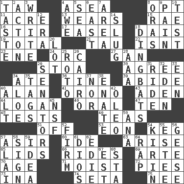 ACROSS 1. The 23rd letter of the Hebrew alphabet 4. Toward the sea 8. Elect 11. Measure of real estate 13. Erodes 15. Actress Charlotte 16. Use a swizzle stick 17. Artist's stand 18. Raised platform 19. "_____ Recall" 21. The 19th letter of the Greek alphabet 22. Is not 23. Compass dir. 24. The grampus (Milton) 27. Separate the seeds from cotton 29. Portico 30. Match 34. Had dinner 36. Prong on a fork 39. Tolerate 40. ____ Jay Lerner 41. U. of Maine site 43. An important port of Yemen 44. Utah city north of Ogden 46. Of the mouth 47. Nine, plus one 48. Trials 49. Afternoon social gatherings 51. Not in operation 53. A really long time 54. Cask 57. SW Saudi Arabia district 60. Binary compound 63. Originate 65. Hats (slang) 66. Amusement-park features 69. Johnson of "Laugh-In" 70. Grow older 71. Wet 72. Sliced desserts 73. _ tizzy (2 wds.) 74. Bristle 75. Born DOWN 1. Clothes sense 2. Gambison 3. Compose 4. Deep reverence 5. Ocean 6. 90 degrees 7. Type of rug 8. Mouths or openings 9. Ache 10. Trial 12. Epoch 14. A hard, heavy blow 18. Empty-headed or silly people 20. Car dealer's back yard 25. Printing process, for short 26. Capital of Egypt 28. Auto club (abbr.) 29. Legislators 31. Travel on an animal 32. Paradise 33. Car or cant ending 34. _ vera 35. Labels 37. And not 38. Related on the mother's side 40. The first octave above the treble staff 42. Margarine 45. Science/research agcy. 50. Santa ___, CA 52. Become taut 54. Japanese brewing company 55. First name in cosmetics 56. Honkers 57. Mountain range southwest of Kyrgyzstan 58. Omen 59. The main thing one is thinking about 61. "Vaya con ____" 62. Singer Brickell 64. Hit sharply and swiftly 67. Eastern Standard Time (abbr.) 68. R.R. building