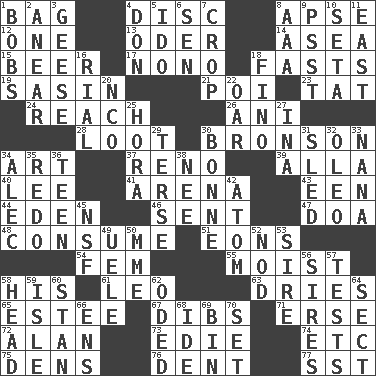 ACROSS 1. Container for groceries 4. Plate 8. Domed church section 12. Single 13. River in Europe 14. Toward the sea 15. Fermented drink made from hops 17. Words to Nanette 18. Goes without food and/or water 19. Indian antelope 21. Luau course 23. Make lace 24. Arrive at 26. Black tropical American cuckoo 28. Spoils 30. "Death Wish" actor 34. Nonscientific branch of learning 37. Former U.S. Attorney General Janet 39. Silent film actress Nazimova 40. Area sheltered from the wind 41. Sports stadium 43. Car or cant ending 44. Paradise 46. Posted 47. ___ good deed 48. Eat 51. Immeasurably long periods of time 54. Opposite of masc. 55. Damp 58. Part of HMS, perhaps 61. Lion 63. Frees from moisture 65. First name in cosmetics 67. Claim 71. Celtic language 72. ____ Jay Lerner 73. Singer Brickell 74. And so on (abbr.) 75. Cub Scout units 76. Scratch 77. Fast jet (abbr.) DOWN 1. Moves up and down 2. Approach 3. Honkers 4. Spanish title 5. Wedding promise 6. Elected rep. 7. Riding implement 8. American Automobile Association (abbr.) 9. Inconspicuous attention getter 10. Bristle 11. Compass direction 16. Monetary unit of Yemen 18. A pale, very dry sherry 20. Non-commissioned officer (abbr.) 22. Rowing implement 25. Israeli folk dance 27. _ tizzy (2 wds.) 29. Laconic 30. Maid-servant 31. Downhill vehicle 32. Butter sub 33. Nanny 34. Actor Baldwin 35. Redecorate 36. Adolescent 38. Born 42. Tiny particle 45. Overdraft (abbr.) 49. Ubangi River tributary 50. Madame (abbr.) 52. Dreamland 53. Title for a man of rank and authority 56. Male parents of animals 57. Trials 58. Froth on beer 59. Capri or Wright 60. Comedian Laurel of Laurel & Hardy 62. Wrote a lyric poem 64. Religious group 66. Followers of ems 68. Binary compound 69. Storage container 70. Put into a specified state