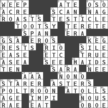 ACROSS 1. Shed a tear 5. Had dinner 8. Bear (Spanish) 11. 43,560 square feet 12. Examine minutely or intensely 13. Tired old horse 14. Ridicules or criticizes harshly 17. One of the two male reproductive glands 19. Tootsie (variant) 21. Cigar-shaped 22. Connect, as a bridge 23. Epoch 24. Girls' org. (abbr.) 27. Greek god of love 29. Barrel 32. Musical pauses 34. River (Sp.) 36. Drop; flow; fall 37. Comfort 38. And so on (abbr.) 39. Loyal 40. At sea 41. Perceive with the eye 42. Unmarried girls 43. "___ Little Indians" 44. "Two Mules for Sister ____" 46. Born 47. American Automobile Association (abbr.) 50. Words to Nanette 52. A viewer who gazes fixedly 55. Michaelmas daisies 57. Characterized by complete cowardliness 59. Ringlike coral islands and reefs 62. Mature 63. Body of Kaffir warriors 64. Horse sense 65. Actress Charlotte 66. Erode 67. Mitch Miller's instrument DOWN 1. Armed conflict 2. Environmental prefix 3. Part of Q.E.F. 4. Mexican monetary units 5. Adept person 6. Clothes sense 7. Keyboard key 8. Single time 9. Table seasoning 10. Double curve, resembling the letter S 12. Filthy place 15. Drinks excessively 16. Play the lead 18. Retirement account (abbr.) 20. Sounds asleep 24. Relatively large 25. Gospel singer Marvin 26. NE Netherlands city 28. Settings 29. Japanese brewing company 30. Evade 31. Honkers 33. Beverage made from leaves 35. Seas 36. R.R. building 42. French painter Edouard 45. Roll call or roster of names 47. Tate display 48. Nest on high 49. Odor 51. U. of Maine site 52. Practice fight 53. Ancient Roman robe 54. Toward shelter 55. Cuckoo 56. Messy guy 58. Choose 60. Nilotic language 61. Compass dir.