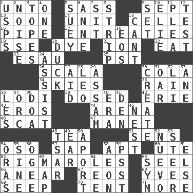 ACROSS 1. To (old English) 5. Backtalk 9. Back-to-school mo. 13. Within a short period 14. A single undivided whole 15. Cell (Danish) 16. Corncob 17. Pleas 19. Compass dir. 20. Color 21. Electrically charged atom 22. Consume 23. Son of Isaac 25. Pacific Standard Time (abbr.) 26. Any of the three canals of the cochlea 30. Root beer relative 34. Atmospheres 35. Precipitation 36. Farming town in central California 39. Administered medicine 42. One of the Great Lakes 43. Greek god of love 44. Sports stadium 46. Jazz singing style 47. French painter Edouard 48. Beverage made from leaves 51. Elected reps. 54. Bear (Spanish) 57. Plant excrement 58. Fitting 60. Shoshoni 62. Complicated, petty procedures 65. Stitch closed the eyes of (a falcon) 66. Approach 67. Vintage cars 68. Jacques Cousteau's middle name 69. Ooze 70. Portable shelter 71. Greater amount DOWN 1. United States Postal Service (abbr.) 2. Annoying sound 3. Drinks excessively 4. Single 5. Chop _ 6. Singer Murray 7. Be seated 8. Long narrow piece of something 9. Arrange properly for use 10. Writer Wiesel 11. Entreaty 12. Trial 15. Patter 18. Greek goddess of the dawn 20. Evade 24. Aid 27. Assist 28. Lion 29. Indian state 30. Make 31. Boat paddle 32. Cards in a Roman deck? 33. A saturated hydrocarbon 36. French article 37. The grampus (Milton) 38. ___ good deed 40. Epoch 41. Lair 45. A home for chicks 48. Russian ruler of old 49. Hearing organ 50. To the left, to Queeg 52. New (sp.) 53. Navigate 54. Mouths or openings 55. Trig term 56. Double curve, resembling the letter S 58. A really long time 59. Inconspicuous attention getter 61. Otherwise 63. Atlas unit 64. Area sheltered from the wind 65. Symbol (abbr.)