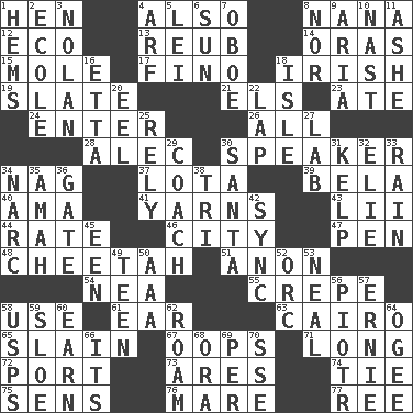 ACROSS 1. Layer 4. In addition 8. Grandmother 12. Environmental prefix 13. Reuben's nickname 14. Mouths or openings 15. Undercover agent 17. Fine (Spanish) 18. From or relating to Ireland 19. Chalkboard 21. Raised railways 23. Had dinner 24. Keyboard key 26. 100% 28. Actor Baldwin 30. Orator 34. Tired old horse 37. Globular water bottle used in Asia 39. Actor Lugosi 40. Housemaid (var.) 41. Tall tales 43. Cards in a Roman deck? 44. Pace 46. Municipality 47. Fenced enclosure 48. Leopard's kin 51. Soon (poet.) 54. Teachers' org. 55. Streamer paper 58. Purpose 61. Ewer handle 63. Capital of Egypt 65. Killed 67. I made a mistake 71. Protracted 72. Left side of a ship or aircraft 73. Ancient Greek god of war 74. Neckwear 75. Elected reps. 76. Female horse 77. To separate or throw off DOWN 1. Is hesitant and indecisive 2. Learning spot: Fr. 3. Pitcher Ryan 4. Sandy's bark 5. Flowery wreath 6. Player for Phoenix 7. Mitch Miller's instrument 8. Not either 9. Roberta Peters solo 10. Political cartoonist Thomas 11. American tennis player Robert 16. Singer James 18. Capri or Wright 20. Snakelike fish 22. Pet locale 25. Trust 27. Experiment locale 29. Team commander 30. Before Barbara or Clara 31. Seaweed 32. Writer Wiesel 33. Water falling in drops from the sky 34. Drug cop 35. Housemaid 36. Yard entry 38. Three (prefix) 42. Synchronize (abbr.) 45. Car or cant ending 49. Adolescent 50. Auto club (abbr.) 52. The grampus (Milton) 53. Actress Patricia 56. Peter (Polish) 57. Bert's buddy 58. United States Postal Service (abbr.) 59. A type of plum 60. Merit 62. Wander 64. Double curve, resembling the letter S 66. It is 68. Mouth or opening 69. For each 70. Compass dir.