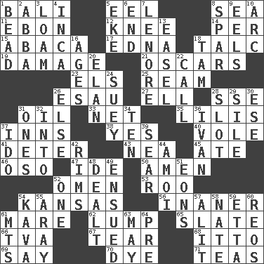 ACROSS 1. Indonesian resort city 5. Snakelike fish 8. Ocean 11. Inky black, to poets 12. Leg joint 14. For each 15. Phillipine bananalike plant 17. Pulitzer Prize-winning author Ferber 18. Baby powder 19. Break 21. Motion picture awards 23. Raised railways 25. 480, 500 or 516 sheets of paper 26. He sold his birthright 27. Pipe bend 28. Compass dir. 31. Petroleum 33. Fish or hair follower 35. Ms. Damita and namesakes 37. Taverns 38. It is so 40. Grand slam 41. Prevent from occurring 43. Teachers' org. 45. Had dinner 46. Bear (Spanish) 47. Binary compound 50. So be it 52. Sign of something about to happen 53. Friend of Pooh 54. Sunflower state 56. More empty; more void 61. Female horse 62. Mass 65. Chalkboard 66. Federal power corp. 67. Pull into pieces 68. "Tell ____ the Marines!" 69. Declare 70. Color 71. Afternoon social gatherings DOWN 1. Necklace unit 2. Swedish rock group 3. Rich soil 4. South American Indian 5. Make supply last 6. Conclude 7. Poe poem 8. Coast Guard woman 9. Snakelike fish 10. Curve 13. Artist's stand 16. Matures 18. Scottish cap 20. Style 22. Give a ring to 24. Chop _ 26. Otherwise 28. Slit 29. Filth; sediment 30. Compass dir. 31. Singles 32. To the inside or interior of 34. "___ Little Indians" 36. _ the terrible 37. Wedding promise 39. Singe 42. Basketball hoops 44. Mine, in Marseilles 48. Started a card game 49. Followed as a consequence or result 51. Immeasurably long periods of time 52. Single 54. Polynesian shrub of the pepper family 55. Like ___ of sunshine 57. Set down 58. Nathan's nickname 59. Singer James 60. Vintage cars 61. Mountains (abbr.) 63. Fifth month 64. Before (prefix)