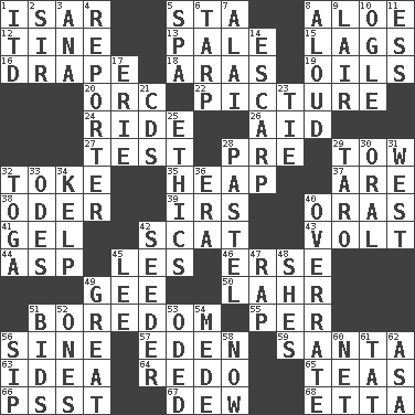 ACROSS 1. Austrian river, tributary to the Danube 5. R.R. building 8. Medicinal plant 12. Prong on a fork 13. Light colored 15. Straggles 16. Window treatment 18. Ancient river in northeast Turkey 19. Lubricates 20. The grampus (Milton) 22. Photo 24. Travel on or in a vehicle 26. Help 27. Trial 28. Before (prefix) 29. Pull behind 32. Puff or smoke 35. Pile 37. "We ___ not amused" (Victoria) 38. Baltic tributary 39. Big collection agency 40. Mouths or openings 41. Set 42. Get outta here! 43. Electrical Unit 44. Viper 45. French article 46. Celtic language 49. Turn to the right 50. Cowardly lion portrayer 51. Mood resulting from idleness 55. For each 56. Trig term 57. Locale of original sin 59. Before Barbara or Clara 63. It may be bright or harebrained 64. Make new 65. Beverages made from leaves 66. Inconspicuous attention getter 67. Morning condensation 68. Singer James DOWN 1. It would 2. Title for a knight 3. Santa ___, CA 4. Newsperson 5. Health resort 6. Canvas cover 7. Mountain range southwest of Kyrgyzstan 8. Verbally 9. Den 10. Stare at amorously 11. Double-curved letter 14. Fortification 17. 4th largest of the Great Lakes 21. Music discs 23. Neckwear 25. Principles of right and wrong 28. Soft color 29. Pacific island yam 30. Spoken 31. 270 degrees 32. Ancient Roman robe 33. Lyric poems 34. Seaweed 36. Period 40. Make much ado about nothing 42. Sowing specialist 45. Area sheltered from the wind 47. Reproach for some lapse or misdeed 48. "______ My Girl" (Turtles hit) 49. Relatively large 51. Auction offers 52. Washington bills 53. Wrote a lyric poem 54. Ancient Persian 56. Small drink 58. At this time 60. Fish or hair follower 61. Make lace 62. White ___ sheet