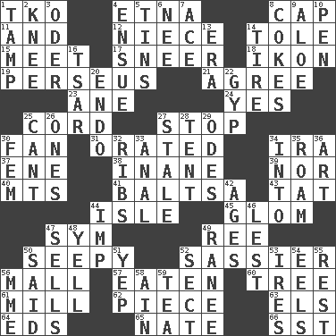 ACROSS 1. Ring climax 4. Inactive volcano in Sicily 8. Head covering 11. Added to 12. Sibling's daughter 14. Lacquered or enameled metalware 15. Confront 17. Contemptuous expression 18. Visual representation of an object 19. Son of Zeus who helped slay Medusa 21. Match 23. A saturated hydrocarbon 24. Affirmative reply 25. Drawstring 27. Halt 30. Air blower 31. Declaimed 34. Lyricist Gershwin 37. Compass dir. 38. Lacking in sense or substance 39. And not 40. Mountains (abbr.) 41. Greek mezzo-soprano Agnes 43. Make lace 44. Small island 45. Take by theft 47. Symbol (abbr.) 49. Portuguese money of account (variant) 50. Oozy 52. More lively and spirited 56. Promenade 57. Ingested 60. Relationship diagram 61. Place where flour is made 62. Component 63. Raised railways 64. Begley and Asner 65. Nathan's nickname 66. Fast jet (abbr.) DOWN 1. Pack (down) 2. Leg joint 3. Baltic tributary 4. Follow as a consequence or result 5. Metal containers 6. Born 7. Adept person 8. Popular sodas 9. _ vera 10. Writing instrument 13. Epoch 14. Become fatigued 16. Russian ruler of old 20. Inside; within (prefix) 22. Hustle 25. Patter 26. Washington bills 27. Showing deterioration from age 28. Portable shelter 29. Lyric poems 30. Opposite of masc. 32. Chest bones 33. Of or related to the anus 34. To the inside or interior of 35. Wander 36. Nonscientific branch of learning 42. Matures 44. Naughty child 46. For fear that 47. Exchanges for money 48. Shout 49. The wife of a rajah (variant) 50. Expressed in words 51. Slangy assent 52. Religious group 53. Angers 54. Snakelike fish 55. Respite 56. Madame (abbr.) 58. The 18th letter of the Arabic alphabet 59. Beverage made from leaves
