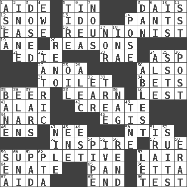 ACROSS 1. Assistant 5. Metal container 8. Raised platform 12. Overwhelm 13. Wedding promise 14. Leg coverings 15. Comfort 16. One who advocates reunion 19. One (Scot) 20. Thinks logically 21. Singer Brickell 23. Actress Charlotte 24. Cleo's killer 27. Small Philippine buffalo 30. In addition 31. Bathroom 34. Wagers 35. Fermented drink made from hops 38. Acquire or gain knowledge or skills 40. For fear that 41. Jai _ 42. Make 44. Drug cop 45. Armor plate that protects the chest 46. Followers of ems 47. Born 50. Nuclear Threat Initiatives 53. Stimulate to action 57. Sorrow 59. Supplementary 63. Den 64. Related on the mother's side 65. Baking dish 66. Singer James 67. Opera by Verdi 68. Conclusion 69. Trial DOWN 1. Toward the sea 2. Empty; void 3. Administered medicine 4. She-sheep 5. Become fatigued 6. The content of cognition 7. Common sense 8. One of the 12 tribes of Israel 9. Black tropical American cuckoo 10. ___ a Wonderful Life 11. Fast jet (abbr.) 14. Introduce or present, as a question 17. Or not 18. _ tizzy (2 wds.) 20. Western Nevada city 22. Of or pertaining to medicine 24. Toward shelter 25. Fast planes 26. Mail 28. Petroleum 29. Actor Baldwin 30. Most capable 32. Ewer handle 33. Woody plant 35. Object of repulsion 36. Enthusiasm 37. Hearing organs 39. Tired old horse 43. Prong on a fork 47. The longest river in the world 48. Compass dir. 49. Eastern Standard Time (abbr.) 51. Feeling or showing extreme anger 52. Sets of matching outer garments 54. Corncob 55. _ the terrible 56. Tear apart 58. Part of Q.E.F. 59. Ocean 60. Corn or form start 61. Groovy apt. 62. Parent Teacher Assoc. 63. Allow