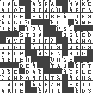 ACROSS 1. Actor Linden 4. "____ silly question..." 8. Cause to be 12. _ vera 14. Arrive at 16. Length times width 17. Travel on or in a vehicle 18. Pleas 20. White American of non-Hispanic descent 22. Pipe bend 23. One (Scot) 24. Portuguese money of account (variant) 25. Coat; cloak 28. 23rd letter of the Greek alphabet 30. Portico 31. Stared 35. "___ Maria" 37. Entreaty 40. Words to Nanette 41. A type of plum 42. Makes a sale 44. Probability 45. Sharp bark 46. Toward the sea 47. River (Sp.) 48. Distance measurement 50. Goad 52. Lair 54. The 19th letter of the Greek alphabet 55. Bank Draft (abbr.) 58. Purpose 61. June honoree 63. Haggard of country music 65. Parts 70. Common sense 71. Den 72. Approach 73. Prepare for publication 74. Johnson of "Laugh-In" 75. Suttee (variant) 76. Begley and Asner DOWN 1. Ethiopian city, capital of Harari 2. Place in a line 3. Inn 4. "We ___ not amused" (Victoria) 5. Elected rep. 6. Krazy ___ of comics 7. 43,560 square feet 8. Floor protector 9. Operatic vocal solo 10. Peachy ____! 11. Relaxation 13. Snakelike fish 15. Aid 19. In addition 21. Baseball player Mel 26. I made a mistake 27. An organ shaped like a helmet 29. Disregard 30. Oozed 32. Farming town in central California 33. Inside; within (prefix) 34. Two (Sp.) 35. Toward shelter 36. Electrical Unit 38. Raised railways 39. Eskimo relative 41. Symbol (abbr.) 43. "Two Mules for Sister ____" 49. Make new 51. Chewing product 53. Nanny 55. Wear away 56. Watery 57. Trials 58. Southern CA. univ. 59. Fly high 60. Send forth 62. Cub Scout units 64. Compass dir. 66. Before (prefix) 67. Teachers' org. 68. Make lace 69. _ Lanka