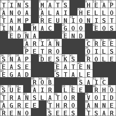 ACROSS 1. Canisters 5. Floor protectors 9. Pile 13. Small Philippine buffalo 14. Jai ____ 15. Phone greeting 16. Pack (down) 17. One who advocates reunion 19. _ tizzy (2 wds.) 20. Apple computer (short form) 21. Thick or sticky substance 22. Greek goddess of the dawn 23. Pulitzer Prize-winning author Ferber 25. Conclusion 26. Believer in; advocate of (suffix) 30. Algonquian 34. Stone: prefix 35. Lubricates 36. Fastener 39. Writing tables 42. Hero or heavy, e.g. 43. Comfort 44. Ingested 46. Mild oath 47. Having lost freshness 48. Director Reiner 51. Ketch in the Levant 54. Institute legal proceedings 57. Atmosphere 58. Area sheltered from the wind 60. 17th letter of the Greek alphabet 62. Interpreter 65. Lacking any legal or binding force 66. Match 67. Through, poetically 68. Singer Murray 69. Former U.S. Attorney General Janet 70. Observes 71. Russian ruler of old DOWN 1. Jacques of French films 2. Empty; void 3. Roamer 4. Plant excrement 5. Hindu Mythology: god of death 6. Actor Baldwin 7. The 19th letter of the Greek alphabet 8. Scorch 9. Layer 10. Writer Wiesel 11. In addition 12. Cooking vessels 15. Parka part 18. Electrically charged atom 20. Female horse 24. Slept 27. It would 28. "We ___ not amused" (Victoria) 29. Olfactory organs 30. Pupil covering 31. _ de Janeiro 32. Pipe bend 33. Compass dir. 36. Perceive with the eye 37. Tired old horse 38. White ___ sheet 40. Krazy ___ of comics 41. R.R. building 45. Otherwise 48. To erase 49. Petroleum 50. Naughty children 52. Metal shackles 53. Large country 54. Play the lead 55. Goad 56. Merit 58. Old wives' tales, e.g. 59. Greek god of love 61. Baltic tributary 63. Modern: prefix 64. Definite Article 65. Large container