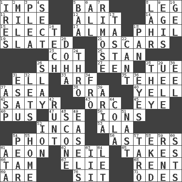 ACROSS 1. Naughty children 5. Long, evenly shaped piece 8. Part of a journey 11. Cause heat under the collar 12. Set down 14. Grow older 15. Opt 17. _ mater 18. Silvers or Donahue 19. Scheduled 21. Motion picture awards 23. Small bed 25. Comedian Laurel of Laurel & Hardy 26. Quiet! 27. Car or cant ending 28. Third day of the wk. 31. Pipe bend 33. Sandy's bark 35. Giggle 37. At sea 38. Mouth or opening 40. Shout 41. Man with strong sexual desires 43. The grampus (Milton) 45. Sight organ 46. Suppuration 47. Purpose 50. Charged particles 52. South American Indian 53. Wing 54. Pictures 56. Michaelmas daisies 61. A really long time 62. Famous astronaut Armstrong 65. Proceeds 66. Scottish cap 67. Writer Wiesel 68. Monthly bill 69. "We ___ not amused" (Victoria) 70. Be seated 71. Lyric poems DOWN 1. Angers 2. Place where flour is made 3. Entreaty 4. Religious group 5. Sound made by sheep 6. Everything 7. Full of chinks, cracks, or crevices 8. Cowardly lion portrayer 9. The front part of a cuirass 10. Set 13. Clothes sense 16. Technician 18. Baking dish 20. Capital of the state of Qatar 22. Patter 24. Through, poetically 26. Kill 28. Those people 29. Ubangi River tributary 30. Snakelike fish 31. He sold his birthright 32. Allows 34. Away 36. Sight organs 37. Viper 39. Roberta Peters solo 42. Undersized animal 44. Root beer relative 48. Biscuitlike quick bread 49. Artist's stands 51. Political cartoonist Thomas 52. Electrically charged atom 54. Lightbulb-shaped fruit 55. Residence 57. Edible starchy tuberous root 58. Made supply last 59. French philosopher Descartes 60. Fast planes 61. "One Day ___ Time" 63. One more than two 64. Allow