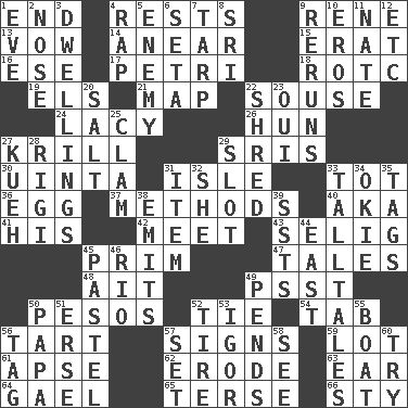 ACROSS 1. Conclusion 4. Musical pauses 9. French philosopher Descartes 13. Solemn pledge 14. Approach 15. Part of Q.E.F. 16. Compass dir. 17. _ dish (used to culture cells) 18. College mil. group 19. Raised railways 21. Atlas unit 22. Boozer 24. Made of lace 26. Attila the _ 27. Shrimp-like planktonic crustaceans 29. Indian titles of respect 30. National forest in Provo, Utah 31. Small island 33. Small child 36. Oval reproductive body of a fowl 37. Modes 40. Alias (abbr.) 41. Part of HMS, perhaps 42. Rendezvous 43. Major League Baseball Commissioner Bud 45. Demure 47. Falsehoods 48. Small island 49. Inconspicuous attention getter 50. Mexican monetary units 52. Make a knot 54. Keyboard key 56. Small pie 57. Omens 59. Car dealer's back yard 61. Domed church section 62. Wear away 63. Hearing organ 64. Highlander 65. Laconic 66. Filthy place DOWN 1. First lady 2. Olfactory organ 3. Residences 4. Hit sharply and swiftly 5. Foe 6. Bristle 7. Canvas cover 8. _ Lanka 9. Summer TV shows 10. Greek god of love 11. Nathan's nickname 12. And so on (abbr.) 20. Table seasoning 22. Tear up 23. Fr. "Yes" 25. Dollar (slang) 27. Malaysian steamed pastry 28. Swiss mountan, "Queen of the Mountains" 29. Groove 31. Detail 32. A female animal or person 33. Baron Munchausen's specialties 34. Migrant worker of the '30s 35. Labels 38. Sends forth 39. Fast planes 44. Compass direction 45. Soft color 46. _ de Janeiro 49. Depends 50. Dad 51. Celtic language 52. Hoop that covers a wheel 53. Composer Stravinsky 55. Water vessel 56. Label 57. Put into a specified state 58. Observe 60. Attempt