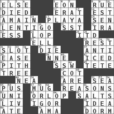 ACROSS 1. Otherwise 5. Period of immesurable duration 8. Regret 11. Passed on 12. Part of Q.E.F. 14. Eastern Standard Time (abbr.) 15. At full speed 17. Beach, in Buenos Aires 18. Elected rep. 19. Small, flat, pigmented spot on the skin 21. Fast jet (abbr.) 22. Lyricist Gershwin 23. Double-curved letter 24. Trim (branches) 25. It would 27. Pipe bend 28. State of inaction 31. Position in a hierarchy or organization 35. Expire 37. Against 38. Comfort 39. Compass dir. 41. On the rocks 42. Heart or essence 43. Compass dir. 45. False hair 46. Woody plant 47. Small bed 49. Teachers' org. 51. "We ___ not amused" (Victoria) 52. Ocean 55. Purulenc 57. Large cup 60. Thinks logically 62. Corn or form start 63. Lowest deck of a ship 65. Table seasonings 66. 54 in ancient Rome 67. Russian composer Stravinsky 68. The content of cognition 69. Had dinner 70. Nursemaid (var.) 71. Dormintory (informal) DOWN 1. Peak District village in England 2. Citrus fruits 3. Seines 4. Prepare for publication 5. Snakelike fish 6. Mouths or openings 7. Negative votes 8. Dwelling 9. One who makes use of a thing 10. Inactive volcano in Sicily 13. Jacques of French films 16. The longest river in the world 17. Cotton for raincoats, e.g. 20. Gilded 26. Distinguishing feature 29. Proofreading order 30. Periodic rise and fall of the sea level 31. Back-to-school mo. 32. Den 33. Clearly or manifestly demonstrative 34. Giggle 36. Followers of ems 40. Fortification 44. Had on 48. Afternoon social gatherings 50. Mine, in Marseilles 52. Twentieth part of a lira 53. Keyboard key 54. Indian state 55. Monetary unit of Botswana 56. A single undivided whole 58. Capital and largest city of Mongolia 59. Take by theft 61. Stated 64. Mouth or opening