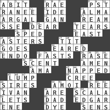 ACROSS 1. "This won't hurt ____!" 5. Actress Charlotte 8. Pacific Standard Time (abbr.) 11. Indian princess (variant) 13. Binary compound 14. _ mater 15. Therefore, facetiously 16. Separate the seeds from cotton 17. 480, 500 or 516 sheets of paper 18. Compass dir. 19. Letter starter 21. Pulls into pieces 22. Hurried 24. Compass direction 25. Michaelmas daisies 27. Teat (slang) 29. Leaves 30. Having ears or earlike features 32. Inside; within (prefix) 33. Goes without food and/or water 35. To erase 39. Aroma 41. So be it 42. Nanny (var.) 43. Slept 45. Mass 48. Algonquian 49. Male parents of animals 50. Mine, in Marseilles 52. To sift 55. "Terrible" tsar 56. "We ___ not amused" (Victoria) 57. Any of the three canals of the cochlea 59. Allows 60. June honoree 61. _ Allan Poe 62. Compass dir. 63. Color 64. Elected reps. DOWN 1. Caspian sea tributary 2. Soap units 3. Eaten 4. Beverage made from leaves 5. Capital of Latvia 6. The sixth month of the Jewish calendar 7. Car or cant ending 8. Entreaties 9. Don Adams' spy role 10. Scottish caps 12. A person who is older than you are 14. Length times width 20. Begley and Asner 21. False hair 23. Mexican monetary units 25. Mature 26. Manchild 27. Make lace 28. Big collection agency 30. Eastern Standard Time (abbr.) 31. Window treatment 33. Opposite of masc. 34. Santa ___, CA 36. Electrical Measurement 37. Observe 38. Conclude 40. Balmoral and tarboosh 43. Non-commissioned officer (abbr.) 44. Get up 45. Make or become more lively 46. A salt of uric acid 47. Not women's 49. Drop; flow; fall 50. Like ___ of sunshine 51. Ancient Persian 53. Liveliness 54. Hearing organs 56. Increase 58. Music discs