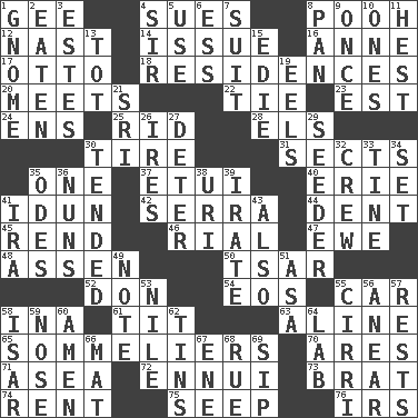 ACROSS 1. Turn to the right 4. Institutes legal proceedings 8. "Silly old bear" 12. Political cartoonist Thomas 14. Come out of 16. Queen of England 1702-14 17. "Beetle Bailey" pooch 18. Dwellings 20. Confronts 22. Standoff 23. Eastern Standard Time (abbr.) 24. Followers of ems 25. To free from 28. Raised railways 30. Hoop that covers a wheel 31. Religious groups 35. Single 37. Needle case 40. One of the Great Lakes 41. Goddess of spring and wife of Bragi 42. Father Junipero _ 44. Gouge 45. Tear apart 46. Monetary unit of Yemen 47. She-sheep 48. NE Netherlands city 50. Russian ruler of old 52. Spanish title 54. Greek goddess of the dawn 55. 4-wheeled motor vehicle 58. _ tizzy (2 wds.) 61. Teat (slang) 63. Place in a line 65. Wine waiters 70. Ancient Greek god of war 71. Toward the sea 72. World-weariness 73. Naughty child 74. Monthly bill 75. Ooze 76. Big collection agency DOWN 1. Dwarf 2. Eroded 3. _____ Park, CO 4. Title for a knight 5. Purpose 6. Curvy letter 7. Costume for a special activity 8. Baking dish 9. Single time 10. Washington bills 11. Behest 13. Small child 15. Singer Brickell 19. Snakelike fish 21. Indian title of respect (Mr.) 26. Angers 27. Prevent from occurring 29. Sowing specialist 30. Watched over 32. Group working together 33. Prong on a fork 34. Arrange properly for use 35. Lyric poems 36. Religious women 38. RI univ. 39. Feeling or showing extreme anger 41. Lyricist Gershwin 43. In addition 49. Short letter 51. White ___ sheet 53. Mediterranean tributary 55. High-altitude cloud 56. Approach 57. Musical pauses 58. Austrian river, tributary to the Danube 59. Sense of smell 60. So be it 62. Metal containers 64. Experiment locale 66. Floor protector 67. Compass dir. 68. Regret 69. Small drink