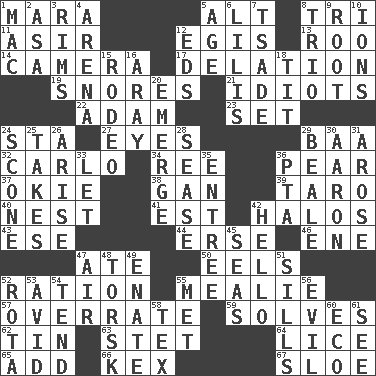 ACROSS 1. Hindu Mythology: god of death 5. The first octave above the treble staff 8. Three (prefix) 11. SW Saudi Arabia district 12. Armor plate that protects the chest 13. Friend of Pooh 14. Device for capturing images 17. Conveyance 19. Sounds asleep 21. Foolish or stupid persons 22. First of billions? 23. Put into a specified state 24. R.R. building 27. Sight organs 29. Sound made by sheep 32. Monte _, Las Vegas Hotel/Casino 34. Portuguese money of account (variant) 36. Lightbulb-shaped fruit 37. Migrant worker of the '30s 38. Separate the seeds from cotton 39. Pacific island yam 40. Egg locale 41. Eastern Standard Time (abbr.) 42. Saint headwear 43. Compass dir. 44. Celtic language 46. Compass dir. 47. Had dinner 50. Snakelike fish 52. Food allowance for one day 55. Ear of corn 57. Make much ado about nothing 59. Finds the solution 62. Shallow baking pan 63. Proofreading order 64. Louse (plural) 65. Say or write further 66. A weed 67. _ gin DOWN 1. Big _ 2. White ___ sheet 3. Basketball hoops 4. Sports stadium 5. Ripen 6. Ms. Damita and namesakes 7. Sadhe (variant) 8. Musical group of three 9. Carrot, for example 10. Charged atoms 12. Begley and Asner 15. Cowboy competition 16. Like ___ of sunshine 18. Teat (slang) 20. Develop 24. Biscuitlike quick bread 25. Receives possession of 26. Originate 28. Gospel singer Marvin 29. Memphis, Tenn. Street 30. Composer Copland 31. Came up 33. Allow 35. Main course 36. Parent Teacher Assoc. 42. Phone greeting 45. Oceans 47. Wind 48. Cod relative 49. Related on the mother's side 51. Beverly of Met fame 52. Roll call or roster of names 53. Enthusiastic 54. Be inclined (to) 55. Was introduced to 56. Morally bad or wrong 58. John Ritter's dad 60. Environmental prefix 61. Observe
