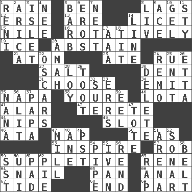 ACROSS 1. Precipitation 5. Benjamin's nick name 8. Fails to keep up a pace 12. Celtic language 13. "We ___ not amused" (Victoria) 14. It is permitted: Lat. 15. The longest river in the world 16. Happening in regular succession 19. Frozen water 20. Choose not to consume 21. Tiny particle 23. Had dinner 24. Sorrow 27. Table seasoning 30. Scratch 31. Opt 34. Give off 35. California wine valley 38. You are 40. Globular water bottle used in Asia 41. Having or resembling wings 42. Cigar-shaped 44. Cuts off 45. Position in a hierarchy or organization 46. "One Day ___ Time" 47. Atlas unit 50. Afternoon social gatherings 53. Heighten or intensify 57. Director Reiner 59. Supplementary 63. French philosopher Descartes 64. Slow-paced one 65. Baking dish 66. Of or related to the anus 67. Event that recurs at intervals 68. Conclude 69. Component DOWN 1. Painter Guido (1575-1642) 2. N. Chile seaport 3. Small island 4. Born 5. Sharp remark 6. Greek god of love 7. Remaining after all deductions 8. 54 in ancient Rome 9. Adept person 10. Set 11. Filthy place 14. Actor's bit 17. American Automobile Association (abbr.) 18. Teat (slang) 20. Nursemaid 22. Motion picture awards 24. San ____ (Riviera town) 25. A single undivided whole 26. Singer James 28. Myrna of the movies 29. A blast of a horn 30. Keyboard key 32. Take to court 33. Blunders 35. Nanny 36. Set down 37. Dad 39. Snakelike fish 43. Lug 47. Place where flour is made 48. One (Scot) 49. Pacific Standard Time (abbr.) 51. Sports stadium 52. Echolocation 54. Corncob 55. "Terrible" tsar 56. Tear apart 58. Waist strap 59. Fast jet (abbr.) 60. Single; one (prefix) 61. Groovy apt. 62. Sliced dessert 63. Strike