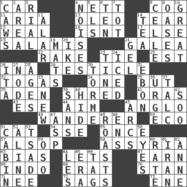 ACROSS 1. Auto 4. Remaining after all deductions 8. Gear tooth 11. Roberta Peters solo 13. Butter sub 14. Pull apart 15. Welt 16. Is not 17. Otherwise 18. Deli grouping 21. An organ shaped like a helmet 22. Libertine 23. Neckwear 25. Eastern Standard Time (abbr.) 26. _ tizzy (2 wds.) 29. A testis 32. Ancient Roman robes 34. Single 35. On the contrary 38. An important port of Yemen 39. Tear up 41. Mouths or openings 43. Compass dir. 44. Direct toward a target or goal 45. White American of non-Hispanic descent 46. Nomad 50. Environmental prefix 51. Feline 54. Compass dir. 55. At one time in the past 57. Columnist Joseph or Stewart 59. Nineveh was its capital 63. Prejudice 64. Allows 67. Merit 68. _ china 69. Part of Q.E.F. 70. Comedian Laurel of Laurel & Hardy 71. Born 72. Settles 73. Compass dir. DOWN 1. Crow sounds 2. Type of rug 3. Monetary unit of Yemen 4. Annoying sounds 5. Raised railways 6. "___ Little Indians" 7. Small child 8. Cell (Danish) 9. Fertile tracts in a desert 10. Relatively large 12. Having or resembling wings 14. Afternoon social gathering 19. Floor protectors 20. Mamie's husband 21. Set 23. Prong on a fork 24. On the rocks 26. Call ___ day 27. Connecting point 28. Ripens 30. Singer Mel 31. Inky black, to poets 33. Afresh 36. Goad 37. Baby powder 39. Without 40. Flintstone garb 42. "Barney Miller" actor Jack 45. Curves 47. Cleo's killer 48. Cooks with dry heat, as in an oven 49. Followers of ems 51. Small house or cottage 52. Place in a line 53. Sadhe (variant) 56. Snake ____ (dice throw) 58. Bear (Spanish) 60. Pace 61. SW Asia republic 62. Queen of England 1702-14 64. French article 65. Period 66. Label