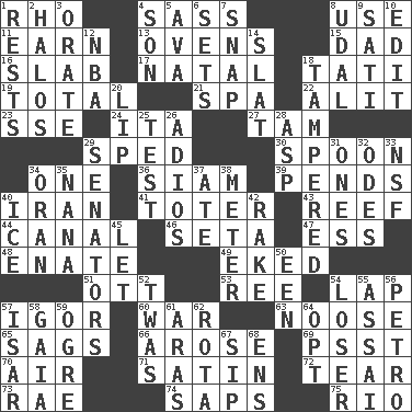 ACROSS 1. 17th letter of the Greek alphabet 4. Backtalk 8. Purpose 11. Merit 13. Baking chambers 15. Male parent 16. Broad, flat, thick piece 17. Relating to or accompanying birth 18. Jacques of French films 19. Add up to 21. Health resort 22. Set down 23. Compass dir. 24. Call ___ day 27. Scottish cap 29. Moved rapidly 30. Soup utensil 34. Single 36. Thailand, formerly 39. Hangs 40. SW Asia republic 41. Carrier 43. Coral ridge 44. Lessep's creation 46. Stalk of a moss capsule 47. Double-curved letter 48. Maternal 49. Supplemented with great effort 51. Baseball player Mel 53. Portuguese money of account (variant) 54. Infant locale 57. Russian composer Stravinsky 60. Armed conflict 63. Trap for birds or small mammals 65. Droops 66. Came up 69. Inconspicuous attention getter 70. Wind 71. Smooth fabric 72. Pull into pieces 73. Actress Charlotte 74. Plant excrements 75. River (Sp.) DOWN 1. Musical pauses 2. Rings 3. Speak pompously 4. Male child 5. Actress Gardner 6. Arranges properly for use 7. Fastener 8. Freehold land 9. Suttee (variant) 10. Prepare for publication 12. Basketball assoc. 14. Narrow board 18. ________ with (broke a safety seal) 20. Mouth edge 25. Trial 26. Goodbye (Sp.) 28. Cleo's killer 29. Elected representatives 31. Washington bills 32. Lyric poems 33. Science/research agcy. 34. Northwest Algerian city 35. Grandmother 37. Had dinner 38. Distance measurement 40. Frozen water 42. Immoral or dissolute person 45. Allow 50. Car or cant ending 52. It was, poetically 54. Failure 55. Slender Brazilian palm 56. Stone: prefix 57. Austrian river, tributary to the Danube 58. Greek goddess of the earth (variant) 59. Legendary monster 61. Ancient river in northeast Turkey 62. Roll call or roster of names 64. Elect 67. Small drink 68. Followers of ems