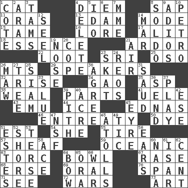 ACROSS 1. Domesticated feline 4. South Vietnam president (1954) 8. Plant excrement 11. Mouths or openings 13. Dutch treat 14. Method 15. Docile 16. Old wives' tales, e.g. 17. Set down 18. Gist 21. Zeal 22. Spoils 23. Indian title of respect (Mr.) 25. Bear (Spanish) 26. Mountains (abbr.) 29. Orators 32. Originate 34. E Mali city 35. Viper 38. Welt 39. Components 41. Ubangi River tributary 43. Australian flightless bird 44. Frozen water 45. Ferber et al. 46. Plea 50. Color 51. Eastern Standard Time (abbr.) 54. A female animal or person 55. Become fatigued 57. To gather and bind into a bundle 59. Pertaining to the sea 63. Torque (variant) 64. Soup holder 67. To erase 68. Celtic language 69. Spoken 70. Connect, as a bridge 71. Perceive with the eye 72. Armed conflicts 73. Nonscientific branch of learning DOWN 1. ____ d'Azur (French Riviera) 2. Caspian sea tributary 3. Scottish caps 4. Erase 5. Wedding promise 6. Ewer handle 7. Madame (abbr.) 8. Twentieth part of a lira 9. Goodbye (Sp.) 10. Stone: prefix 12. Stitch closed the eyes of (a falcon) 14. Impair 19. Characteristic smell of wine 20. Police officer (slang) 21. Wind 23. Three-handed card game 24. Vintage cars 26. Opening into something insatiable 27. Woody plant 28. Thailand, formerly 30. Match 31. Saudi Arabian king (1953-1964) 33. Change direction abruptly 36. Transmit 37. Frolic 39. Essential or central part 40. 43,560 square feet 42. Compass dir. 45. Jane of fiction 47. Science/research agcy. 48. Ringlike coral islands and reefs 49. Nervous spasm 51. _____ Park, CO 52. Dinah or Pauly 53. Laconic 56. Hearing organs 58. Adept person 60. California wine valley 61. Austrian river, tributary to the Danube 62. Penny 64. Arrow shooter 65. Mouth or opening 66. Armed conflict