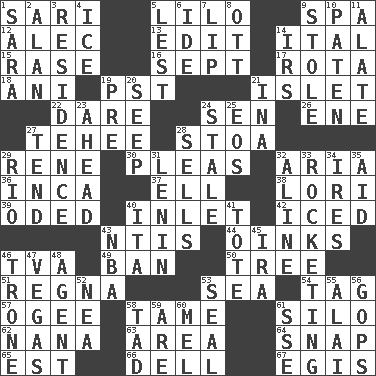 ACROSS 1. Indian skirt 5. _ and Stitch 9. Health resort 12. Actor Baldwin 13. Prepare for publication 14. Slanted text style (abbr.) 15. Raze (variant) 16. Back-to-school mo. 17. Roll call or roster of names 18. Black tropical American cuckoo 19. Pacific Standard Time (abbr.) 21. Small island 22. Have the gumption 24. Elected rep. 26. Compass dir. 27. Giggle 28. Portico 29. French philosopher Descartes 30. Entreaties 32. Operatic vocal solo 36. South American Indian 37. Pipe bend 38. Australian parrot (variant) 39. Wrote a lyric poem 40. An arm off of a larger body of water 42. On the rocks 43. Nuclear Threat Initiatives 44. Pig sounds 46. Federal power corp. 49. Forbid 50. Family _ (genealogy) 51. Canadian anthropologist Darnell 53. Ocean 54. Label 57. Double curve, resembling the letter S 58. Docile 61. Grain storage tower 62. Grandmother 63. Type of rug 64. Fastener 65. Eastern Standard Time (abbr.) 66. Small valley 67. Armor plate that protects the chest DOWN 1. "Two Mules for Sister ____" 2. ____ Jay Lerner 3. Dwelling 4. Frozen water 5. For fear that 6. Binary compound 7. Mouth edge 8. Baseball player Mel 9. Fur scarf 10. Eucharist need 11. Having winglike extensions 14. Big collection agency 19. Before (prefix) 20. Ooze 21. _ tizzy (2 wds.) 23. At or in the front 24. Showing deterioration from age 25. Greek goddess of the dawn 27. Be inclined (to) 28. Makes a sale 29. _ de Janeiro 31. Soviet premier 1918-24 32. Place in a line 33. Shooting up abruptly 34. Angers 35. Assist 40. Call ___ day 41. Carry 43. Basketball assoc. 45. Lyricist Gershwin 46. Heavy duty weighing machine 47. Viva Las _ 48. Rep 52. Teachers' org. 53. Lick closed 55. Jai _ 56. Republicans 58. Bit 59. "We ___ not amused" (Victoria) 60. Cartoonist voice _ Blanc 61. Compass dir.
