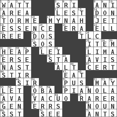 ACROSS 1. Electrical Unit 5. _ Lanka 8. Black tropical American cuckoo 11. Type of rug 12. For fear that 14. Spanish title 15. Singer Mel 17. Non-adult bird? 18. _ stream 19. Gist 21. Period 22. Pipe bend 23. To riddle 24. Two (Sp.) 25. Affectionate concern, for short 27. Mayday 28. A distinct part 31. Pile 35. Flowery wreath 37. Pale green bean 38. Celtic language 39. R.R. building 41. Opinion 42. Political cartoonist Thomas 43. The first octave above the treble staff 45. An absolute certainty 46. Commotion 47. Ingest 49. Title for a knight 51. Fluid product of inflammation 52. Fifth month 55. Allow 57. Chief or king in Benin or Nigeria 60. Player piano 62. Actress Gardner 63. In a vacuum (with "in") 65. More uncommon 66. Commissioned military rank (abbr.) 67. Blunders 68. Part of speech 69. Fast jet (abbr.) 70. Observe 71. Pismires DOWN 1. Wetness 2. Came up 3. Laconic 4. Docile 5. Secret 6. French philosopher Descartes 7. Austrian river, tributary to the Danube 8. Descriptive word 9. Christmas carol 10. International (abbr.) 13. Not this but _ 16. Extremities 17. Makes clutter 20. Calm and collected 26. Pale purple color 29. Independent ruler or chieftain 30. Vertical spar for supporting sails 31. Coop moms 32. Part of Q.E.F. 33. Helper 34. _ dish (used to culture cells) 36. Call ___ day 40. City in Syria 44. "Change" in Tahitian 48. Russian ruler of old 50. Be footloose 52. Person of subnormal intelligence 53. Eskimo relative 54. Entertaining tales 55. Fails to keep up a pace 56. Nights before holidays 58. Soap units 59. 1/640 square mile 61. Nanny 64. Purpose