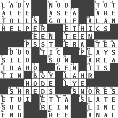 ACROSS 1. Kenny Rogers chart-topper in '80 5. Lower and raise head in agreement 8. Small child 11. Toward shelter 12. Toward the sea 14. "We ___ not amused" (Victoria) 15. For Whom the Bell _____ 17. Eighteen holes 18. ____ Jay Lerner 19. Assistant 21. Value system 23. Car or cant ending 25. Adolescent 26. Inconspicuous attention getter 27. Epoch 28. Afternoon social gathering 31. Superhero pair 33. Nervous spasm 35. Frolics 37. Grain storage tower 38. Male child 40. Length times width 41. Potato state 43. Commissioned mil. rank 45. It is 46. Shallow baking pan 47. Male child 50. Cowardly lion portrayer 52. Method 53. Sodium hydroxide 54. Fragments 56. Sounds asleep 61. Needle holder 62. Singer James 65. Chalkboard 66. Institute legal proceedings 67. It's straight from the horse's mouth 68. Actor's bit 69. Conclusion 70. To sift 71. Of or related to the anus DOWN 1. Thin strip of wood or metal 2. _ vera 3. Small valley 4. Sharp bark 5. Tired old horse 6. Bear (Spanish) 7. Erase 8. Baby powder 9. Mouths or openings 10. Nine, plus one 13. Following 16. Perceives with the eye 18. The 18th letter of the Arabic alphabet 20. Take ten 22. Pile 24. Nuclear Threat Initiatives 26. "Silly old bear" 28. Small pie 29. Sight organs 30. White ___ sheet 31. "You Light Up My Life" star Conn 32. Uhlan (variant) 34. Gear tooth 36. Den 37. Be seated 39. 1994 drama film starring Jodie Foster 42. Mitch Miller's instrument 44. Negative votes 48. More peculiar 49. Last past 51. Coop moms 52. Medical imaging device (abbr.) 54. Make senseless or dizzy 55. Became colored 57. Water jar 58. Water falling in drops from the sky 59. Inactive volcano in Sicily 60. Stitch closed the eyes of (a falcon) 61. Compass dir. 63. Neckwear 64. A saturated hydrocarbon