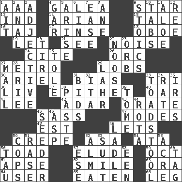 ACROSS 1. Auto club (abbr.) 4. An organ shaped like a helmet 9. Play the lead 13. Indiana (abbr.) 14. Believer in; advocate of (suffix) 15. Story 16. _ Mahal 17. Remove soap 18. Mitch Miller's instrument 19. Allow 21. Observe 22. Annoying sound 24. Quote 26. The grampus (Milton) 27. Paris' subway 29. Tennis shots 30. Satellite of Uranus 31. Prejudice 33. Three (prefix) 36. 54 in ancient Rome 37. Curse 40. Boat paddle 41. Area sheltered from the wind 42. The sixth month of the Jewish calendar 43. Speak pompously 45. Backtalk 47. Methods 48. Eastern Standard Time (abbr.) 49. Allows 50. Streamer paper 52. White ___ sheet 54. _ moment's notice (2 wds.) 56. Frog relative 57. Evade 59. Sep. follower 61. Domed church section 62. Grin 63. Mouth or opening 64. One who makes use of a thing 65. Consumed 66. Part of a journey DOWN 1. Small island 2. Of or related to the anus 3. Descriptive word 4. Slender fish 5. Get up 6. Actor's bit 7. Relaxation 8. One (Scot) 9. Unemotional ones 10. Bar bills 11. Medicinal plant 12. Portuguese money of account (variant) 20. Hoop that covers a wheel 22. Trap for birds or small mammals 23. Globe 25. Lacquered or enameled metalware 27. Promenade 28. One of the Great Lakes 29. Cowardly lion portrayer 31. Auction offers 32. Call ___ day 33. Inedible or poisonous agaric 34. Assign a rank or rating to 35. Angers 38. Thick mixture 39. Heavy book 44. Roll call or roster of names 45. Sowing specialist 46. Viper 49. Dipping utensil 50. 911 reaches them 51. Raze (variant) 52. _ mater 53. Set or collection 55. Measure of real estate 56. The 19th letter of the Greek alphabet 57. Compass dir. 58. Car or cant ending 60. Label