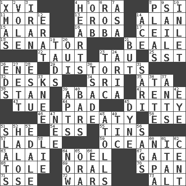 ACROSS 1. 16 4. Israeli folk dance 8. Air pressure measure (abbr.) 11. Greater amount 13. Greek god of love 14. Actor Alda or Thicke 15. Having or resembling wings 16. Swedish rock group 17. To provide with a ceiling 18. Elected representative 21. Calif. Air Force Base 22. Tense 23. The 19th letter of the Greek alphabet 25. Fast jet (abbr.) 26. Compass dir. 29. What propaganda does 32. Writing tables 34. _ Lanka 35. _ moment's notice (2 wds.) 38. Comedian Laurel of Laurel & Hardy 39. Phillipine bananalike plant 41. French philosopher Descartes 43. Third day of the wk. 44. Groovy apt. 45. Short, simple song 46. Plea 50. Compass dir. 51. A female animal or person 54. Double-curved letter 55. Metal containers 57. Dipping utensil 59. Pertaining to the sea 63. Jai _ 64. Christmas carol 67. Yard entry 68. Lacquered or enameled metalware 69. Taken by mouth 70. Connect, as a bridge 71. Compass dir. 72. Armed conflicts 73. Keyboard modifier key DOWN 1. Dec. holiday 2. Short-tailed, large-bodied rat 3. SW Asia republic 4. Centers 5. Globe 6. Director Reiner 7. White ___ sheet 8. Entreaties 9. Travel by water 10. An arm off of a larger body of water 12. Part of Q.E.F. 14. Adept person 19. Small boys 20. Fr. "Yes" 21. With the exception that 23. Torque (variant) 24. Operatic vocal solo 26. Begley and Asner 27. Remaining after all deductions 28. He sold his birthright 30. Sadhe (variant) 31. Indian skirt 33. Leg joint 36. False hair 37. Pismires 39. Flats, for short 40. Soap units 42. Sight organ 45. Unit of force 47. Born 48. Ringlike coral islands and reefs 49. Nervous spasm 51. Narrow boards 52. Auras 53. Peak District village in England 56. Droops 58. Whopper 60. California wine valley 61. Slanted text style (abbr.) 62. Penny 64. Immediately 65. Mouth or opening 66. Ewer handle