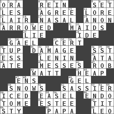 ACROSS 1. Mouth or opening 4. It's straight from the horse's mouth 8. Put into a specified state 11. French article 12. Match 14. Old wives' tales, e.g. 15. Den 17. Relating to the nose 18. At once, immediately (arch.) 19. Moved like an arrow 21. Women servants 23. Whopper 24. Binary compound 25. Highlander 27. Certainty 30. Uncastrated adult male sheep 31. Break 34. Fast jet (abbr.) 37. Double-curved letter 38. Soviet premier 1918-24 39. _ moment's notice (2 wds.) 40. Had dinner 41. Makes clutter 43. Director Reiner 44. Electrical Unit 45. Pile 47. Followers of ems 49. Set 50. Frozen precipitation (plural) 52. More impudent 56. On the rocks 57. Artist's stand 60. Inside; within (prefix) 61. Heavy book 62. First name in cosmetics 63. Teat (slang) 64. Filthy place 65. Dad 66. Lion DOWN 1. Water jar 2. Hitchcock's "____ Window" 3. SW Saudi Arabia district 4. The wife of a rajah (variant) 5. Mild oath 6. Big collection agency 7. Teachers' org. 8. Something which is sent 9. Greek god of love 10. Nine, plus one 13. Shade tree 14. Put down 16. Hero or heavy, e.g. 20. Rampant 22. Small island 25. Abrupt rush of wind 26. Domed church section 27. 2nd pers. sing. pres. of can (arch.) 28. The front part of a cuirass 29. French philosopher Descartes 30. Beverage made from leaves 32. _ mater 33. Confront 34. "Two Mules for Sister ____" 35. Cease 36. Keyboard key 42. "______ My Girl" (Turtles hit) 44. Compass dir. 46. Otherwise 47. Foe 48. Thickened enlargement 49. An organ shaped like a helmet 50. Highlander 51. Observe 52. Ooze 53. International (abbr.) 54. Singer Brickell 55. Printing process, for short 56. ___ a Wonderful Life 58. Cleo's killer 59. R.R. building