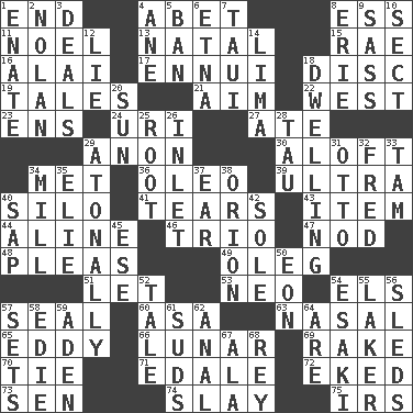 ACROSS 1. Conclusion 4. Collude with 8. Curvy letter 11. Christmas carol 13. Relating to or accompanying birth 15. Actress Charlotte 16. Jai ____ 17. World-weariness 18. Plate 19. Falsehoods 21. Direct toward a target or goal 22. 270 degrees 23. Followers of ems 24. RI univ. 27. Had dinner 29. Soon (poet.) 30. At or to great height 34. Was introduced to 36. Margarine 39. Extreme 40. Grain storage tower 41. Pulls apart 43. A whole individual unit 44. Place in a line 46. Musical group of three 47. Allow head to fall sleepily 48. Entreaties 49. Cassini of fashion 51. Allow 53. Modern: prefix 54. Raised railways 57. Lick closed 60. White ___ sheet 63. Relating to the nose 65. Whirlpool 66. Type of eclipse 69. Libertine 70. Neckwear 71. Peak District village in England 72. Supplemented with great effort 73. Elected rep. 74. Kill 75. Big collection agency DOWN 1. Related on the mother's side 2. Pitcher Ryan 3. Allots cards 4. A saturated hydrocarbon 5. Forbid 6. Inactive volcano in Sicily 7. "Change" in Tahitian 8. One of the Great Lakes 9. Backtalk 10. Religious group 12. Falsehood 14. Pale green bean 18. Residence 20. Player for Phoenix 25. Carrot, for example 26. An arm off of a larger body of water 28. The 19th letter of the Greek alphabet 29. Without tonality 31. Von Bismarck 32. Flintstone 33. Scottish cap 34. Place where flour is made 35. Writer Wiesel 37. Hearing organ 38. Greek mythologigal hunter 40. Plant excrement 42. Not divided or shared with others 45. Compass dir. 50. Period of immesurable duration 52. Lie 54. 1973 Nobel Price Winner (Physics) Leo 55. Member of a famous L.A. basketball team 56. Bobsleighs 57. Arranges properly for use 58. Singer Brickell 59. An important port of Yemen 61. Soap bubbles 62. Of or related to the anus 64. "We ___ not amused" (Victoria) 67. Wing 68. Marina Del _, California