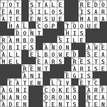 ACROSS 1. Small child 4. Having lost freshness 9. Do over again 13. Hearing organ 14. Grain storage towers 15. Austrian river, tributary to the Danube 16. Had dinner 17. Follow as a consequence or result 18. Hindu Mythology: god of death 19. Actor Linden 21. Police officer (slang) 22. Woman's close-fitting hat 24. Do not 26. Part of HMS, perhaps 27. Role for Stallone 29. Filth; sediment 30. Off-Broadway awards 31. At once, immediately (arch.) 33. Deep reverence 36. Everything 37. Turned at an angle; bent 40. Ocean 41. Cartoonist voice _ Blanc 42. Hearing organs 43. Musical pauses 45. Monthly bill 47. Ascend 48. Black tropical American cuckoo 49. Armor plate that protects the chest 50. Ingested 52. 54 in ancient Rome 54. And so on (abbr.) 56. Hindu god of fire 57. Popular sodas 59. Sandy's bark 61. Billionth: prefix 62. U. of Maine site 63. Teachers' org. 64. Arabian gulf 65. Portable shelters 66. "___ Little Indians" DOWN 1. Afternoon social gathering 2. Pledge 3. Excercise machine 4. Compass dir. 5. Tinged 6. In addition 7. Central Nebraska county 8. Compass dir. 9. Full of chinks, cracks, or crevices 10. He sold his birthright 11. Have the gumption 12. Mouth or opening 20. Ear part 22. One or ones belonging to thee 23. Petroleum 25. Sense of smell 27. Wander 28. Competent 29. Sty mamas 31. Blind as ____ 32. Or not 33. Helper 34. Moistens 35. Comfort 38. Soviet premier 1918-24 39. To be drawn or hauled along 44. 4th largest of the Great Lakes 45. Food allowance for one day 46. Compass dir. 49. Happening 50. Mild oath 51. Singer Murray 52. Old wives' tales, e.g. 53. Picture 55. Algonquian 56. Santa ___, CA 57. Small bed 58. Mayday 60. Avid follower