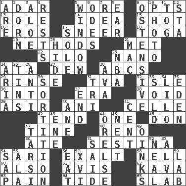 ACROSS 1. The sixth month of the Jewish calendar 5. Had on 9. Elects 13. Hero or heavy, e.g. 14. The main thing one is thinking about 15. Went for two points 16. Greek god of love 17. Contemptuous expression 18. Ancient Roman robe 19. Modes 21. Was introduced to 22. Grain storage tower 23. Billionth: prefix 24. "One Day ___ Time" 27. Morning condensation 28. Lettered men learn these first 29. Wash lightly 31. Federal power corp. 32. Small island 36. To the inside or interior of 37. Epoch 38. Nothingness 39. SW Saudi Arabia district 40. Black tropical American cuckoo 41. Cell (Danish) 42. Look after 44. Single 46. Spanish title 47. Prong on a fork 48. Former U.S. Attorney General Janet 50. Had dinner 51. French poetic form 54. Indian skirt 56. Glorify 58. 1994 drama film starring Jodie Foster 60. In addition 61. Opinion 62. Polynesian shrub of the pepper family 63. Ache 64. Periodic rise and fall of the sea level 65. Broad, flat, thick piece DOWN 1. "We ___ not amused" (Victoria) 2. Dormintory (informal) 3. Medicinal plant 4. Musical pauses 5. Light entry point 6. Lyric poems 7. To separate or throw off 8. Ewer handle 9. Clearly or manifestly demonstrative 10. Picture 11. Coat; cloak 12. R.R. building 17. Flatfish 20. Flintstone garb 21. Big _ 23. Basketball assoc. 24. Roberta Peters solo 25. Canisters 26. Against 28. Actress Gardner 30. Conclusion 31. Three (prefix) 33. Exchanged or delivered for money 34. _ and Stitch 35. Genesis locale 37. Conclusion 40. One (Scot) 41. Penny 43. Compass dir. 44. Threatening words 45. A home for chicks 47. Tarsus (plural) 49. Pig sounds 51. Stated 52. Actress Patricia 53. Inventor's middle name 54. Plant excrement 55. Wing 56. Erode 57. 16 59. Experiment locale