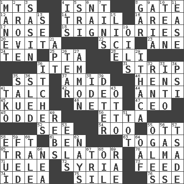 ACROSS 1. Mountains (abbr.) 4. Is not 8. Yard entry 12. Caspian sea tributary 14. Get behind 16. Length times width 17. Characteristic smell of wine 18. Seigniories (variant) 20. Webber/Rice musical 22. _-fi 23. A saturated hydrocarbon 24. "___ Little Indians" 25. Parent Teacher Association (abbr.) 28. Biblical high priest 30. Detail 31. Empty completely 35. Fast jet (abbr.) 37. Among 40. Coop moms 41. Baby powder 42. Cowboy competition 44. Opposed to 45. Malaysian steamed pastry 46. Remaining after all deductions 47. Corporate head (abbr.) 48. More peculiar 50. Singer James 52. Observe 54. Friend of Pooh 55. Baseball player Mel 58. Bank Draft (abbr.) 61. Benjamin's nick name 63. Ancient Roman robes 65. Interpreter 70. _ mater 71. Ubangi River tributary 72. Damascus' land 73. Nourish 74. It may be bright or harebrained 75. Filth; sediment 76. Compass dir. DOWN 1. French painter Edouard 2. Collection of objects 3. Indian antelope 4. It is 5. _ Lanka 6. Tired old horse 7. Airtight sealed metal containers 8. Slender fish 9. Roberta Peters solo 10. Adolescent 11. Relaxation 13. Arrange properly for use 15. Louse (plural) 19. Petroleums 21. Fitting 26. Lacerate 27. ID or VA city 29. New York city 30. Strong, restless desires 32. French philosopher Descartes 33. To the inside or interior of 34. Air pressure measure (abbr.) 35. Saudi Arabian king (1953-1964) 36. Downhill vehicle 38. Binary compound 39. Prevent from occurring 41. Ring climax 43. Von Bismarck 49. Confederate soldiers (slang) 51. Small child 53. Snakelike fish 55. Stares at amorously 56. Domesticates 57. Sadhe (variant) 58. Needle holder 59. Flintstone 60. Lie 62. Negative votes 64. Clumsy lout 66. Teachers' org. 67. Three (prefix) 68. Lubricate 69. Actress Charlotte