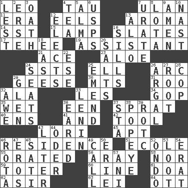 ACROSS 1. Lion 4. The 19th letter of the Greek alphabet 7. ____ Bator, Mongolia 11. Epoch 12. Snakelike fish 13. Odor 14. Fast jet (abbr.) 15. Desk light 16. Chalkboards 17. Giggle 19. Aide 21. Adept person 23. _ vera 24. Fast planes 25. Pipe bend 26. Curve 29. Honkers 30. Mountains (abbr.) 31. Friend of Pooh 32. According to 33. French article 34. Republican Party 35. Dripping 36. Car or cant ending 37. Small fatty European fish 40. Followers of ems 41. Plus 42. Utensil 43. Australian parrot (variant) 45. Fitting 46. Home 51. Learning spot: Fr. 55. Spoke pompously 56. Like ___ of sunshine 58. And not 59. Carrier 60. Actor's bit 61. ___ good deed 62. SW Saudi Arabia district 63. Flowery wreath 64. Baseball player Mel DOWN 1. For fear that 2. Celtic language 3. Pledge 4. Beverage made from leaves 5. _ mater 6. United States Postal Service (abbr.) 7. A salt of uric acid 8. Globular water bottle used in Asia 9. So be it 10. Political cartoonist Thomas 12. Opts 13. In addition 16. Beverly of Met fame 18. Comfort 20. Table seasonings 22. Compass dir. 24. Theater features 25. Make improvements or corrections to 26. Therefore, facetiously 27. Carrot, for example 28. Police officer (slang) 29. Small, secluded valley 32. Deep reverence 33. Soviet premier 1918-24 36. Having ears or earlike features 37. R.R. building 38. Wimpy's pal 39. College mil. group 43. 61 cubic inches 44. Baltic tributary 46. Roll call or roster of names 47. Greek god of love 48. Suttee (variant) 49. Give a ring to 50. 4th largest of the Great Lakes 52. Southwest Nigerian state 53. Plunder 54. Part of Q.E.F. 57. Cuckoo