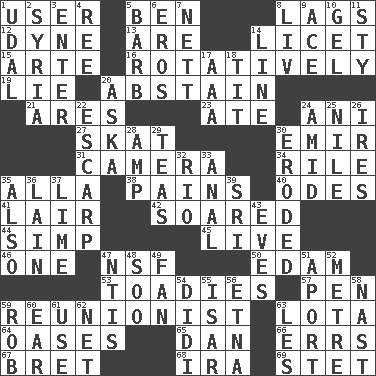ACROSS 1. One who makes use of a thing 5. Benjamin's nick name 8. Falls behind 12. Centimeter-gram-second unit of force 13. "We ___ not amused" (Victoria) 14. It is permitted: Lat. 15. Johnson of "Laugh-In" 16. Rotating or pertaining to rotation 19. Falsehood 20. Choose not to consume 21. Ancient Greek god of war 23. Had dinner 24. Cuckoo 27. Three-handed card game 30. Arab leader 31. Device for capturing images 34. Cause heat under the collar 35. Silent film actress Nazimova 38. Aches 40. Lyric poems 41. Den 42. Flew 44. Simple or foolish person 45. Not recorded 46. Single 47. Science/research agcy. 50. Dutch treat 53. Sycophants 57. Writing instrument 59. One who advocates reunion 63. Globular water bottle used in Asia 64. Fertile tracts in a desert 65. One of the 12 tribes of Israel 66. Blunders 67. Cy Young winner Saberhagen 68. Lyricist Gershwin 69. Proofreading order DOWN 1. Hereditary estate 2. Damascus' land 3. Keyboard key 4. To separate or throw off 5. Sharp remark 6. Greek god of love 7. Remaining after all deductions 8. 54 in ancient Rome 9. Adept person 10. Set 11. Filthy place 14. Actor's bit 17. American Automobile Association (abbr.) 18. Teat (slang) 20. "____ silly question..." 22. Fortification 24. Among 25. The longest river in the world 26. Angers 28. Electrical Unit 29. Afternoon social gatherings 30. Worn away 32. River (Sp.) 33. Of or related to the anus 35. In addition 36. (Had) reclined 37. Welles in "The Third Man" 39. _ Lanka 43. Nights before holidays 47. Nuclear Threat Initiatives 48. "Barney Miller" actor Jack 49. Avid follower 51. To the left, to Queeg 52. Distance measurement (Brit.) 54. "You Light Up My Life" star Conn 55. Austrian river, tributary to the Danube 56. Inactive volcano in Sicily 58. Political cartoonist Thomas 59. Director Reiner 60. Ewer handle 61. Purpose 62. Fish or hair follower 63. French article